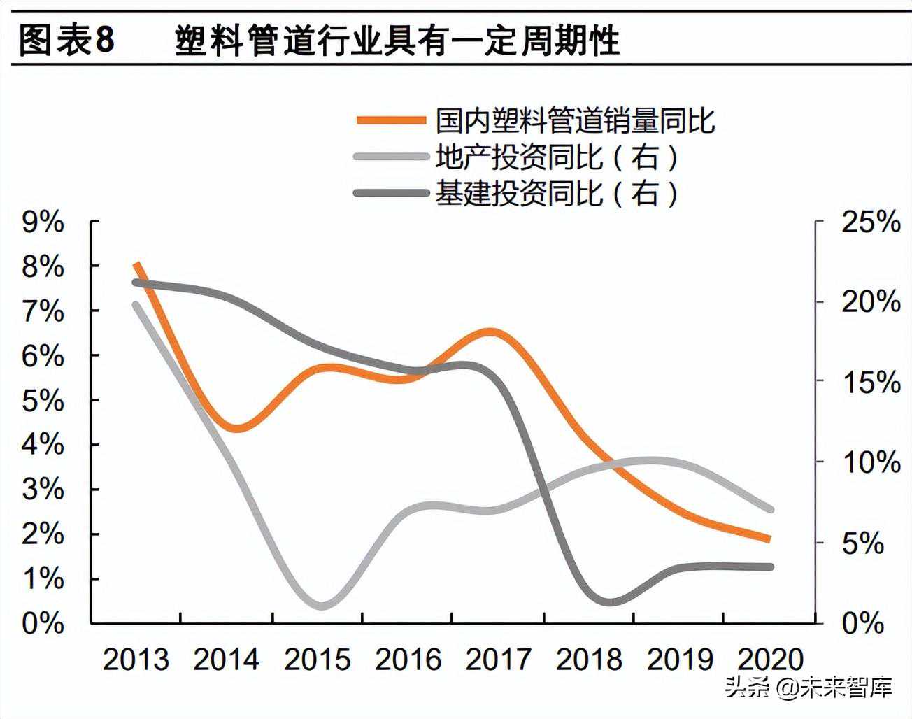 塑料管道周期性特征弱于水泥等传统建材行业。因塑料管道广泛用于建筑、市政工程、农村水利管网、电力通信建设,受宏观经济、地产与基建投资影响,具有一定周期性特征,但周期性弱于水泥、玻璃等传统建材,主要因塑料管道应用领域不断扩大、渗透率提升,带动整体需求保持增长。据产业信息网披露,2009-2015年塑料管道占所有管道比重约从30%升至50%。