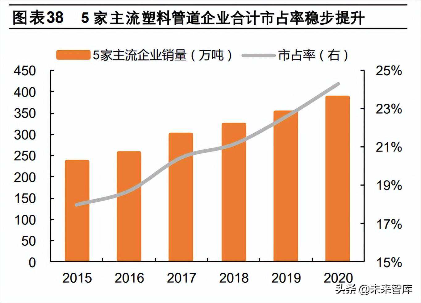 行业集中度较低,呈现“一超多强”局面。据华经产业研究院估算,目前国内规模以上塑料管道企业数量在3000家以上,其中年产能1万吨以上的企业约300家,仅20家左右年产能超过10万吨。2015-2020年,五家主流塑料管道企业(中国联塑、伟星新材、公元股份、顾地科技、沧州明珠)合计销量市占率从18.0%提升至24.3%,但集中度仍明显低于水泥等建材行业。其中,中国联塑销量市占率最高,2020年为16.4%,伟星新材、公元股份、顾地科技、沧州明珠分别为1.7%、4.1%、1.1%、1.0%。