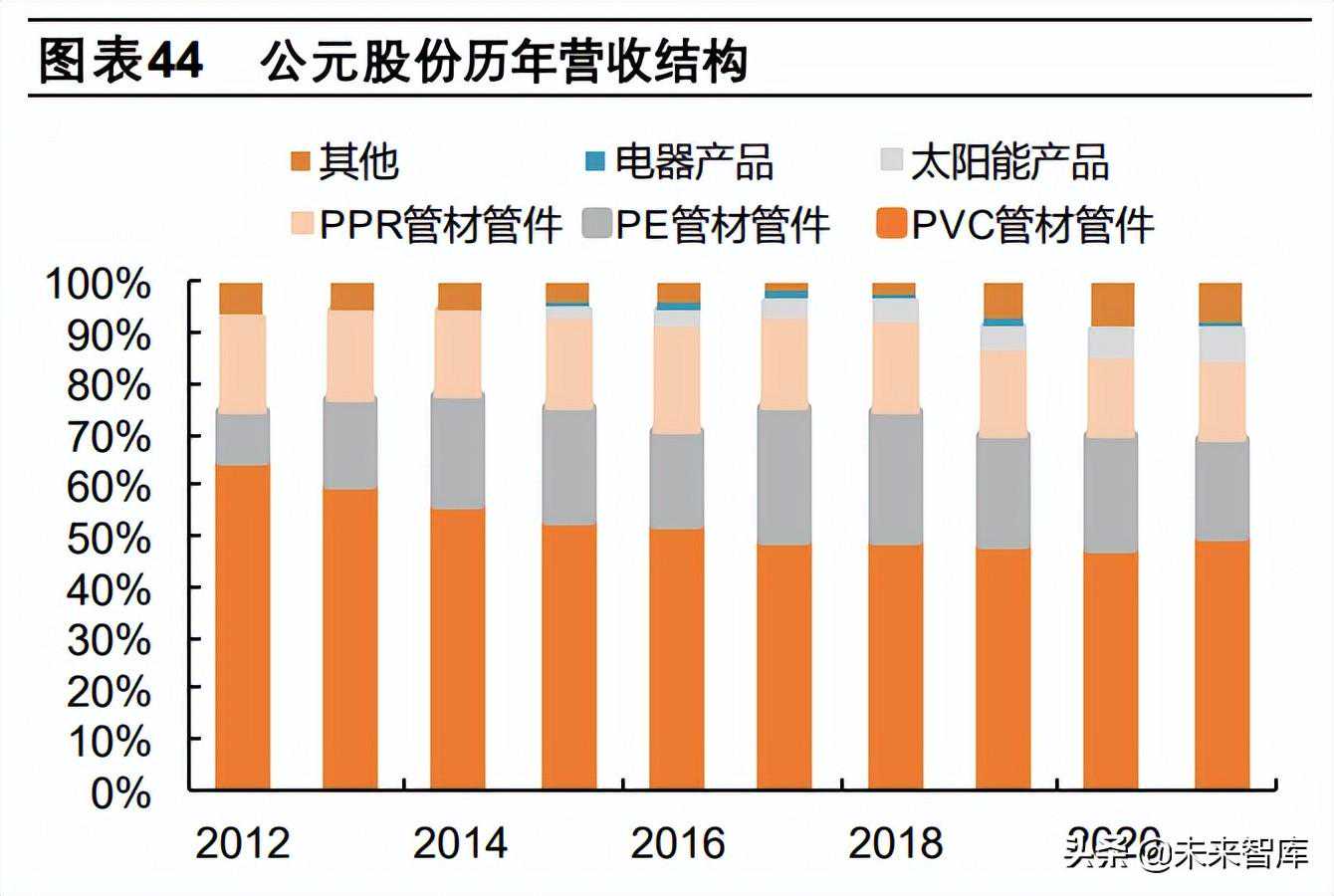 公元股份塑料管道产销规模行业第二,产品同样以PVC管为主,主要布局华东区域。公元股份为国内大型城乡管网建设综合配套服务商,公司产品广泛应用于建筑工程给水、排水、市政工程给水、排水排污、供暖、电力电缆保护、城镇中低压燃气输送、工业系统、农村饮用水、农业灌溉。2021年公司塑料管道销量72.9万吨,年产能100万吨以上,产销规模仅次于中国联塑。从产品结构看,公司以PVC管为主,2021年PVC管、PE管、PPR管营收分别占比50.1%、18.9%、15.3%。从区域结构看,公司布局以华东区域为主,2021年营收占比61%。据公元股份披露,经销渠道占其2021年主营业务收入60%左右,出口(含塑料管道业务和太阳能业务)占比约15%,地产直接配送占比约12%,家装业务占比约6%,市政直接招投标业务工程占比约4%,燃气管道占比约3%。