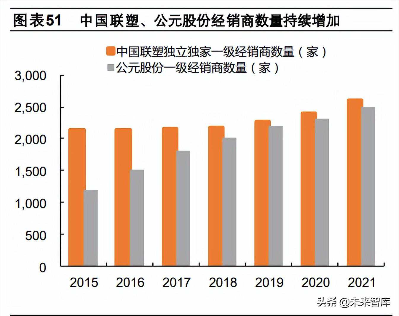 联塑等行业龙头纷纷大力拓展经销商,奠定渠道优势。目前塑料管道龙头企业普遍采取经销为主、直销为辅的销售模式,2015-2021年末中国联塑拥有的独立独家一级经销商数量从2130多家升至2603家;公元股份亦构建一张涵盖省地级中心城市,并辐射下属县城、乡镇的庞大经销网络,2014-2021年一级经销商数量从1100多家升至2500多家。由于渠道建设需要投入大量资金、以及较长的渠道和销售队伍建设周期,特别是建设全国性营销网络需要一套科学的组织结构、标准化的业务管理流程、完善的人才引进及培育体系,以实现营销管理、价格与质量管控、物流配送、库存等各个环节的精细化管理,联塑等行业龙头已奠定领先的渠道优势。