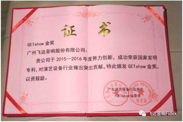 广州飞达音响股份有限公司作为商会副会长单位,受邀参加此次盛会,并荣获GETshow金奖(数字音频处理器)及银奖(高科技有源DSP线阵列扬声器)二个大奖。