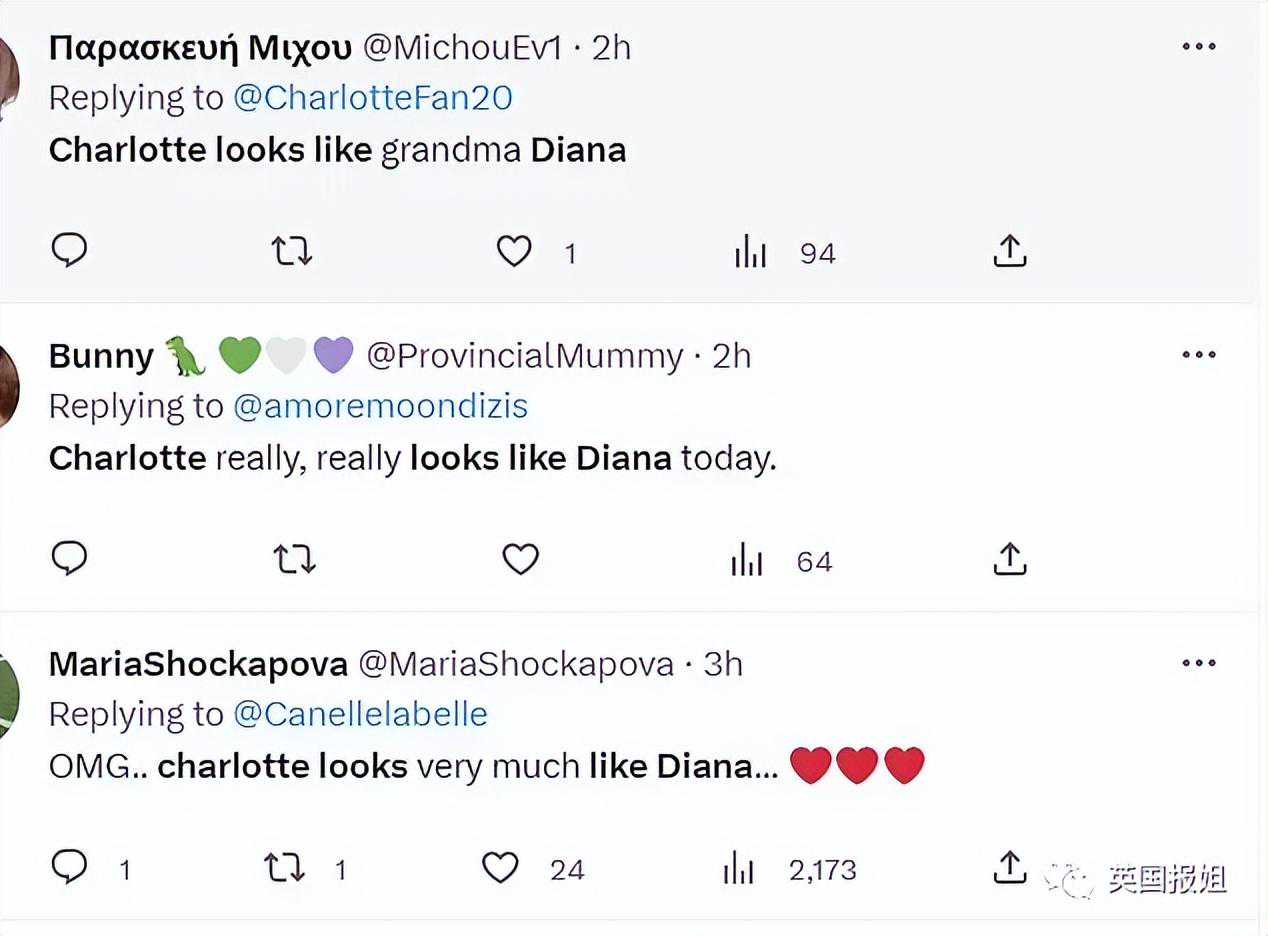 小公主夏洛特不光在这天美翻全场,欧美网友们还惊讶地发现,她不光和太奶奶伊丽莎白二世长得像,还和奶奶戴安娜越来越像了。