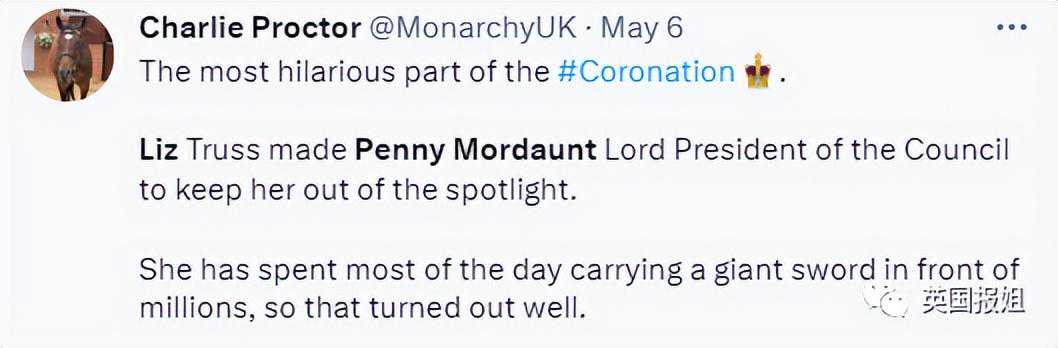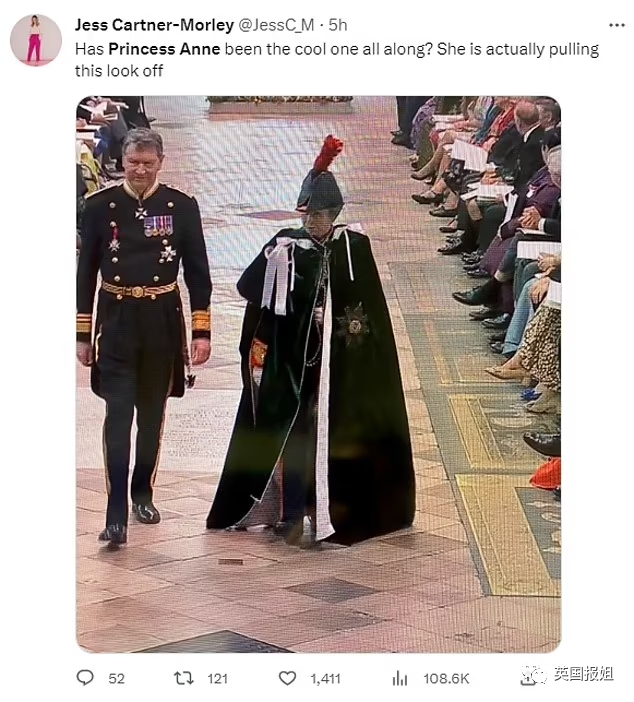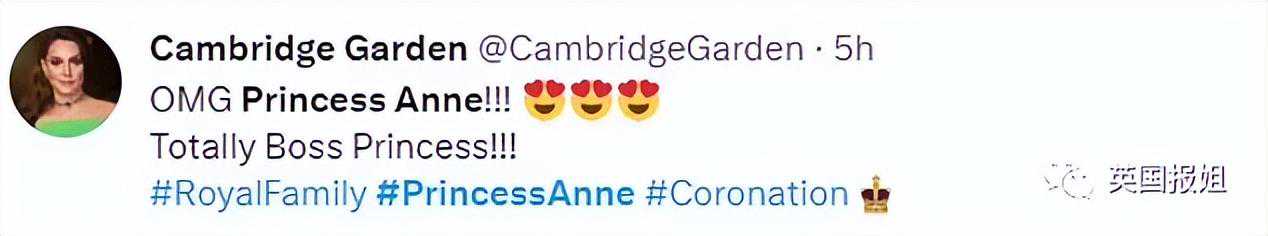 加冕后她作为金杖侍卫在查尔斯的马车后护驾,也让网友她赞不绝口,说她才是加冕礼真正的王者。