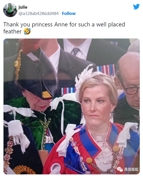 不过安妮这次出圈,其实是因为她头顶军帽上的红色羽毛,全程挡住了大教堂里坐在她身后的哈里王子。大家是不是觉得这次哈里回英国照片很少?