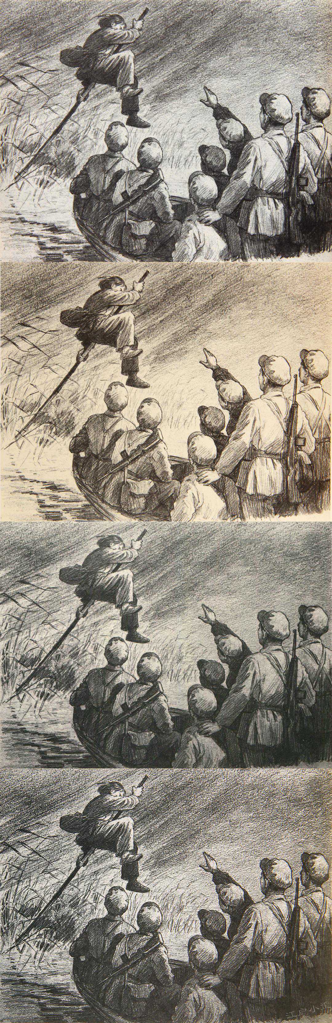 单说老版,就有1955年的上美初版、1956年外文版、1962的人美花边版、1977年上美版(77版将55初版画面做了微小修改,即军帽添上五角星,军装领口添领章,故而渡江被简单划分为55版和77版)。