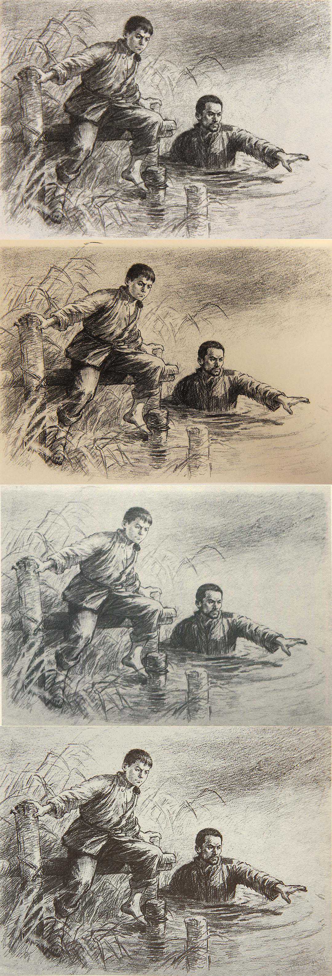 我还选了四幅顾炳鑫百年画展看到的原稿,以之和四组印刷品对比。
