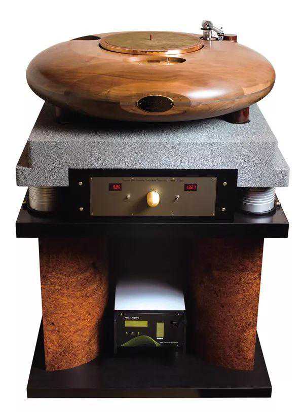 R-evolutionMeteor-Stealth是瑞士AudioConsulting公司开发推出的一款直驱双速(33-1/3、45转)唱盘,特别之处在于其独一无二的外观结构,呈偏球体形状的机箱(也是底盘之一)由工匠耗费两个星期,从20年树龄的一整块干透的美国胡桃木木头,经精雕细刻制造出设计者想要的外形与结构。从其相当昂贵的价格来看,精挑细选的元器件无疑一定是极高品质的上品,其中就包括使用比铜线更优秀的银线绕制的电机和变压器。除这两点外,为了确保与价格相称的声音表现,R-evolutionMeteor-Stealth在技术与功能上更注重于抗振与驻波的抑制与消除上,并且采用电池供电,可安装两支唱臂。