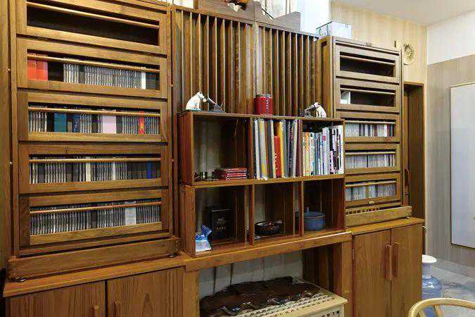 聆听位置后面简单的唱片柜兼具扩散效果,说简单实则富贵藏于其中,主人对收藏黑胶唱片出手快狠准,只要品相优良的不惜一掷千金,这个柜子中的头版黑胶唱片价值过百万元