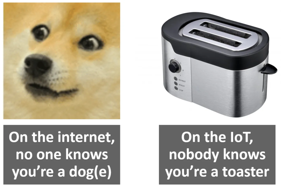 这里有一个90年代的老笑话:“在互联网上,没有人知道你是只狗。”(当然现在我们会说“doge”【1】!)这个笑话有了一个新的版本:“在物联网上,没有人知道你是一台烤面包机。”