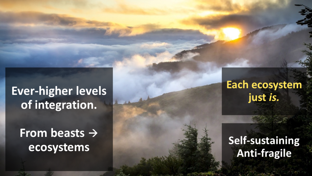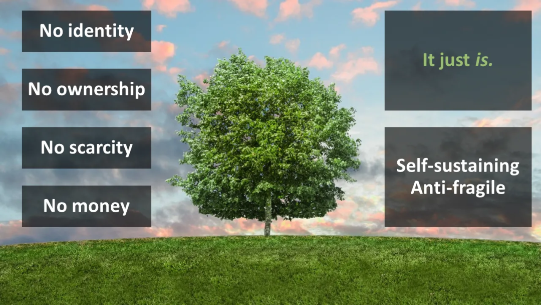 在更高的层面上,我们还可以看到一些群体形态。它们没有身份、所有权、稀缺性或货币——它们只是存在着。它们是自给自足、反脆弱的。
