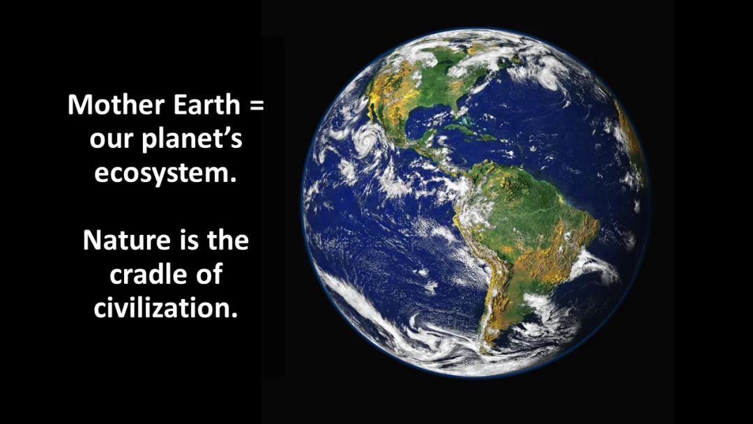 如果我们再往上看,我们能看到最大的生态系统是我们的星球——地球母亲。我们以及周围的生态系统,生活在支持我们、培育我们的基底上。这是我们的摇篮、我们文明的摇篮。没有它,我们一无所有。这就是Nature。
