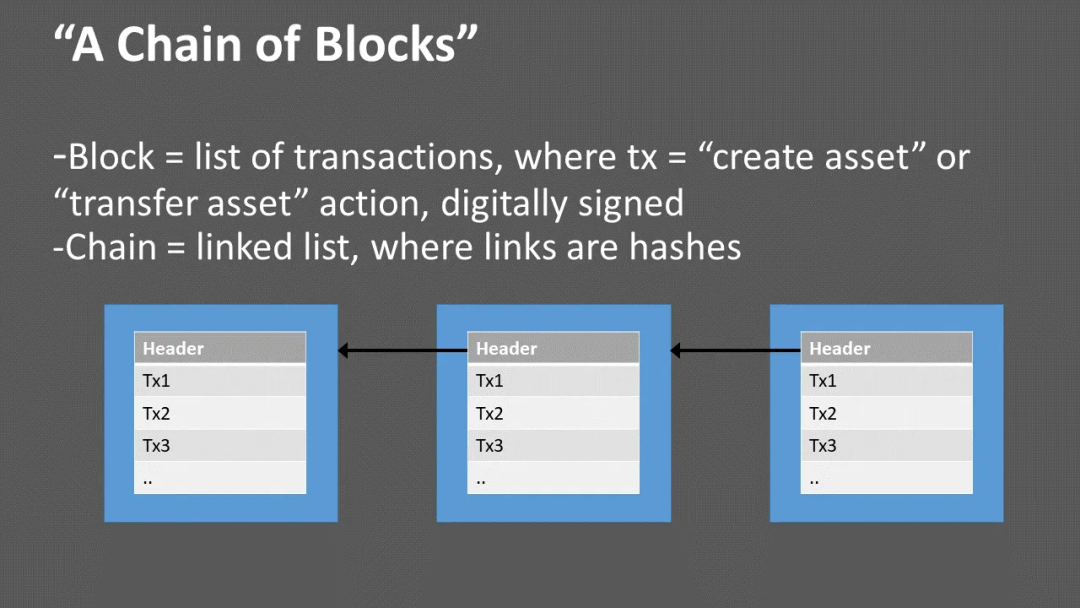 一旦你有了这些交易列表——这些“区块”——你只需要以一种安全的方式将它们链接在一起。它形成了一种“区块链”结构,其中每个链接都是指向上一个区块的哈希指针。然后,你可以让任何人保留这个列表的副本,每个人的副本都会自动与全球其他人的副本同步。也就是说,这些列表是基于“共识”的。