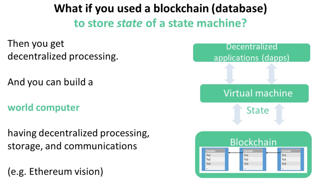 “智能合约平台”我们可以将区块链视为去中心化的处理平台,而不仅仅是结构化数据存储平台(数据库)。也就是说,它是“智能合约”的基础设施。从概念上讲,我们添加了一个虚拟机(VM)来运行智能合约,并使用去中心化的数据库来存储该虚拟机的状态。