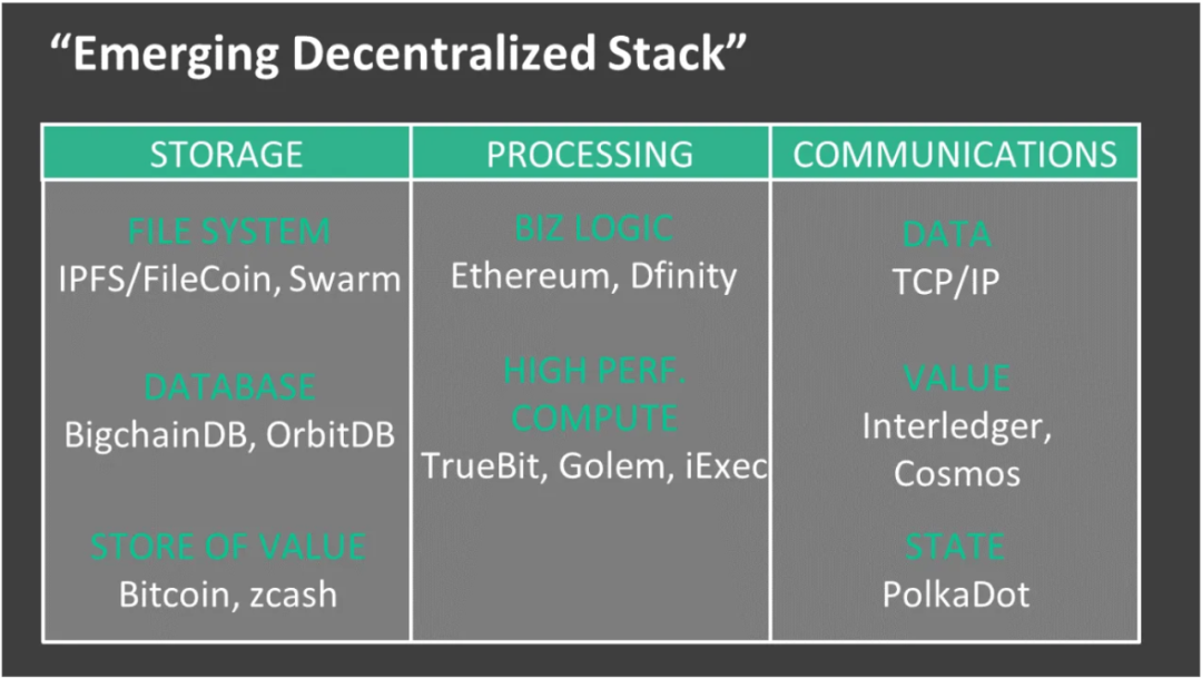 我已经描述了我们如何将区块链框架化为去中心化数据库或处理平台。我们可以泛化这一概念。在过去,我们已经有了桌面端、早期的Web(LAMP堆栈)、云(例如AWS服务)、移动设备等计算堆栈。现在我们有一个新兴的计算堆栈,用于区块链——去中心化计算堆栈。