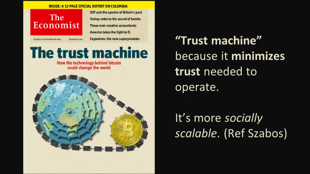 区块链通过使用密码学和共识机制而不是声誉,提供了对交易更高的信心,只需很少的花费,在几秒钟或几分钟内完成转账。换句话说,作为“信任机器”,区块链技术最大限度地减少了运作所需的信任(人类/银行),从而使得越来越多的人能够在无需中间人的情况下进行交互。NickSzabo将其称为“社会可扩展性”。