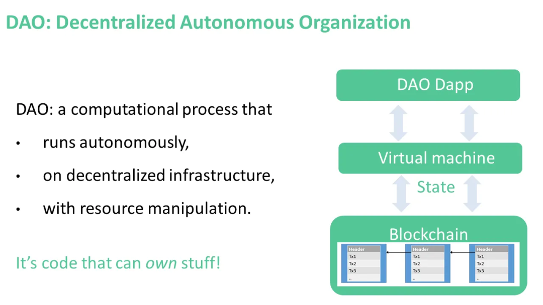 “去中心化自治组织(DAO)”我们可以更高层次地描述区块链,将其视为“去中心化自治组织(DAO)”。DAO是在去中心化基础设施上自主运行的计算过程。没有人可以关掉它,即使是贝索斯(他可以关掉AWS)。同时,它还具有资源操纵功能,包括钱包,可以持有比特币、以太坊等数字资产。