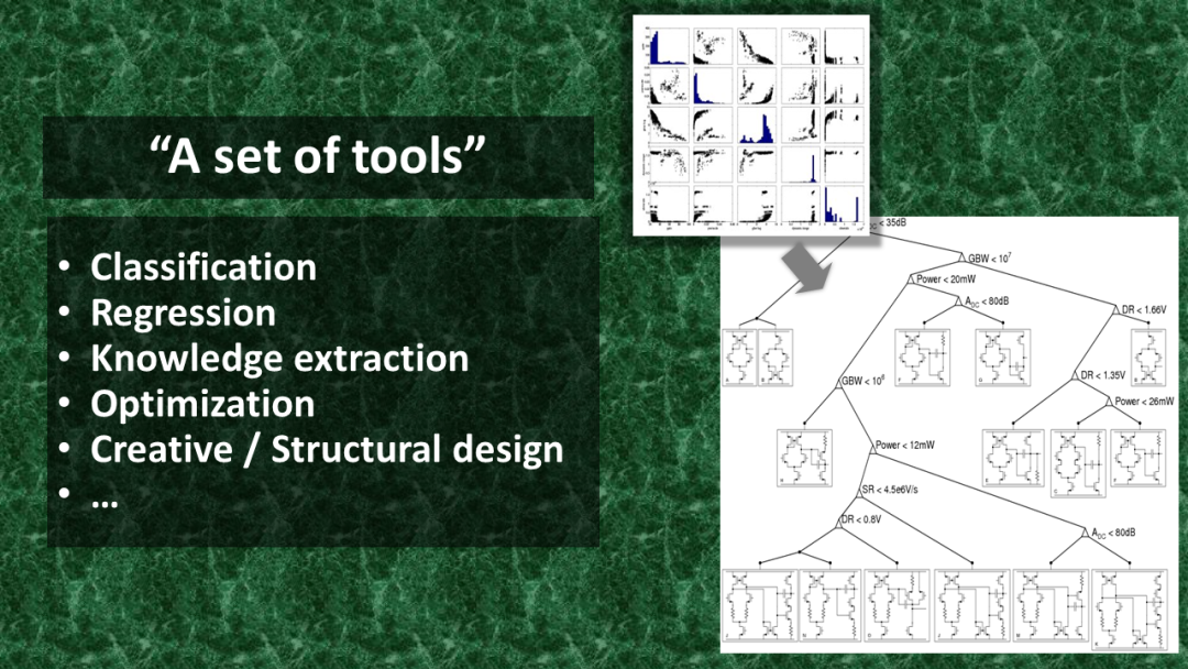 AI可以被看作是一组工具,如分类、回归、知识提取、优化、创意设计等。下面这张图片就是一个例子,输入一个五维的原始数据集,并输出一棵决策树,用于做电路设计决策[McConaghy等,2008]。