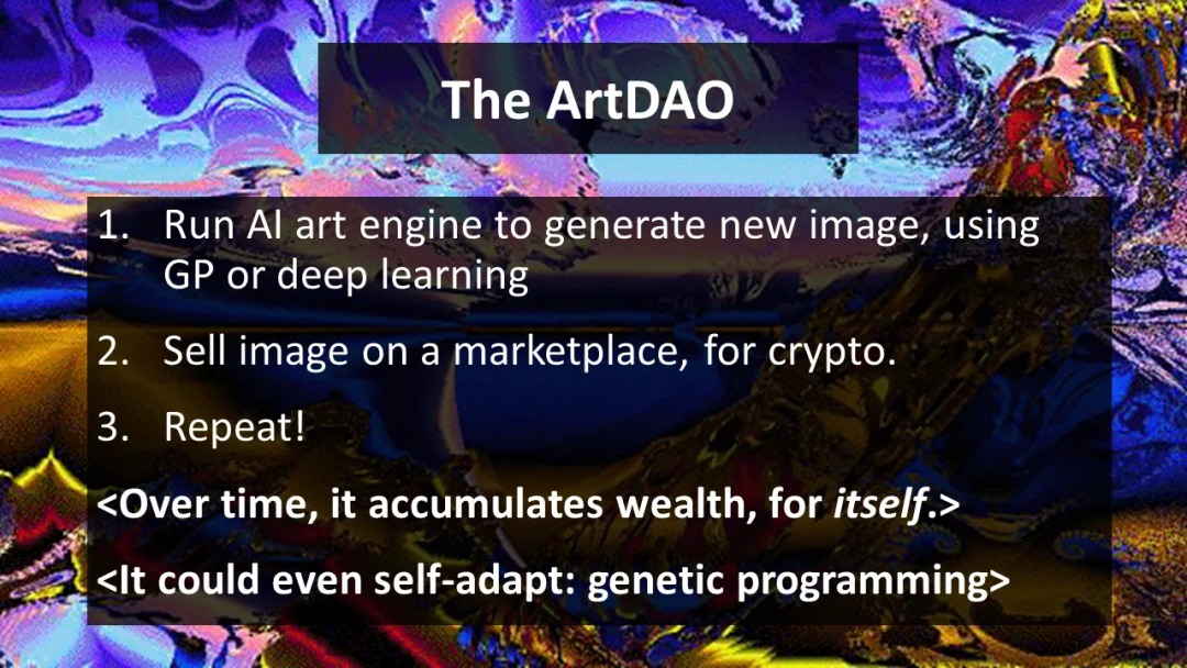 首先,创建一个DAO,使用AI来生成艺术品,例如使用遗传编程(GP)或者DeepDreams(神经网络的变形)。
