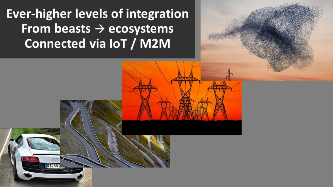 我们还可以进行更高层次的融合。我们可以从最低层次的植物和动物开始,逐步进入更高级的生态系统,例如道路、电力网,甚至是更多的智能机器和设备。当然,这些设备需要和物联网、机器对机器通信等连接在一起。