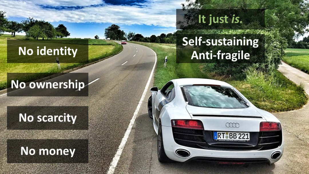 这些车辆不需要身份,不需要所有权。它们没有稀缺性的概念,甚至没有货币的概念。它只是存在着。自给自足、反脆弱。