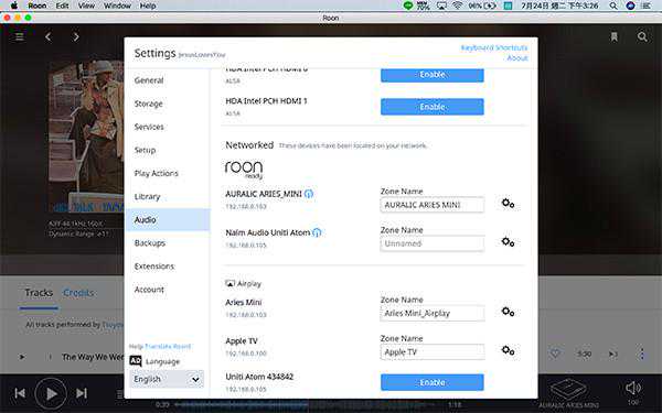 只要接上网络,有线或无线皆可,Roon会自己抓到它,上图可见,出现在NetworkPlayer列表,以及Airplay设备栏里,您只要按下Enable就可使用。