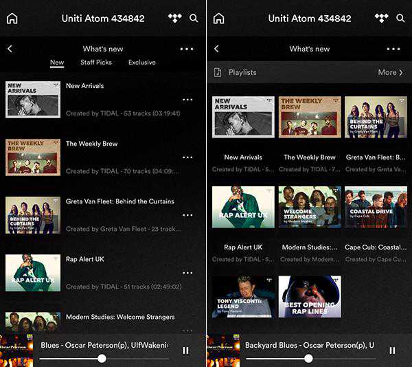 这是NaimApp内建Tidal的画面,进去之后可以选择播放清单。以此为例说明页面显示方式,可以条列式,也可封面显示,封面还可选择大张或小张,也就决定了一页可以呈现的封面数量。