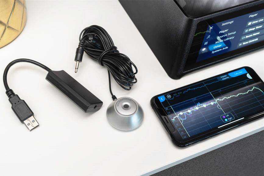将BS312连接完成后,就进入到M10另一个强大的核心功能-DiracLive空间声学校正出场的时候了。同好应该都知道音响设备再好,如果摆放的位置和空间条件不好,声音的表现就会大受影响,这里就需要通过空间声学校正处理来进行实时补偿。DiracLive怎么知道需要补偿哪些呢?这里就要用到「DiracLive」APP了,将安装该APP的设备与M10置于同一局域网中,将M10连接标配的测试麦克风后,DiracLive就能引导操作对空间的9个点进行测试,以完全了解空间的频率响应状况,用图表方式显示测量得到的结果,从而让人能清楚比较校正前、后的效果。之后可以直接使用DiracLive计算好的结果上传给M10,也可以针对频率响应等进行手动调整,重新计算后另存新结果传给M10。