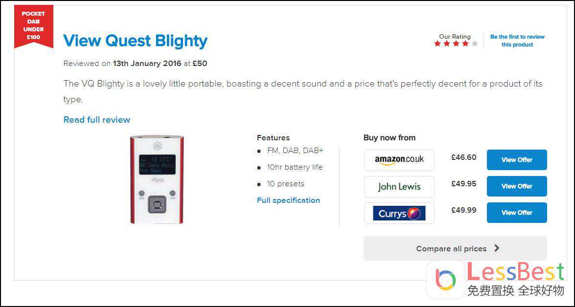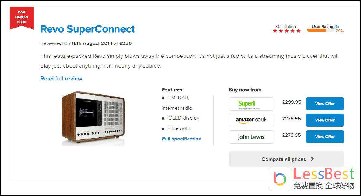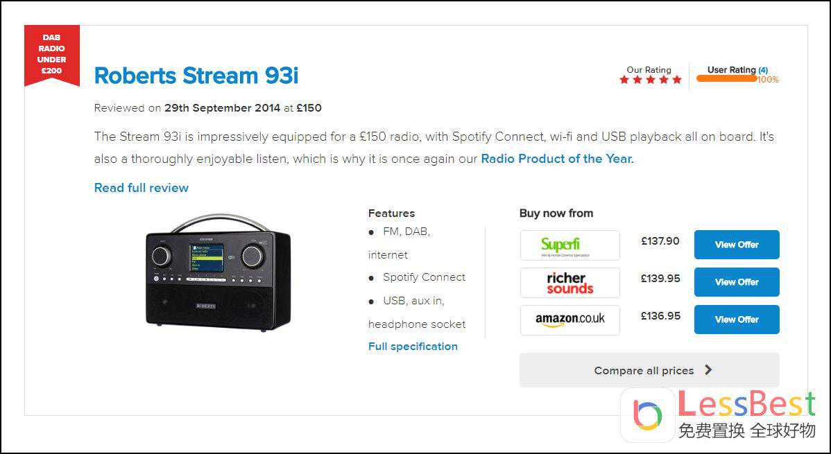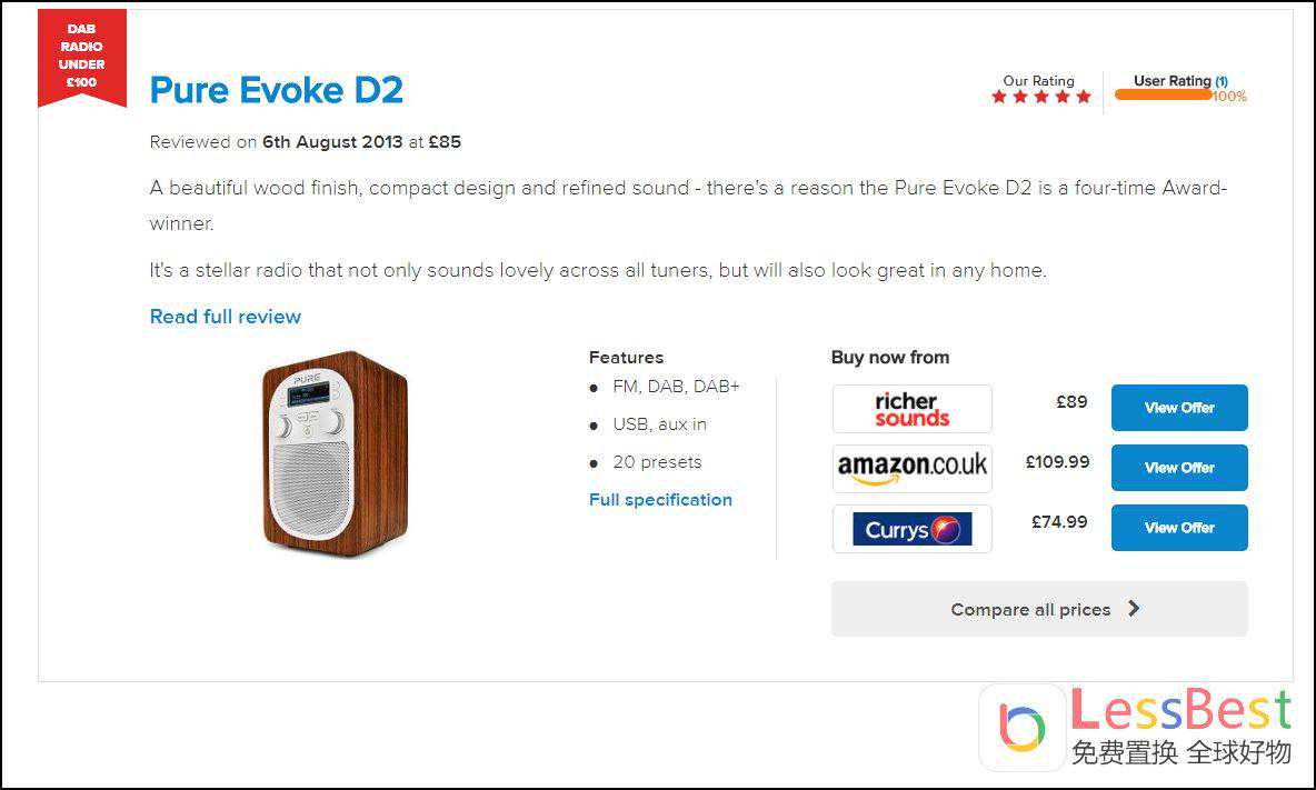 推荐理由:200英镑以内最好的DAB收音机。可重点考虑。英国亚马逊150英镑左右。