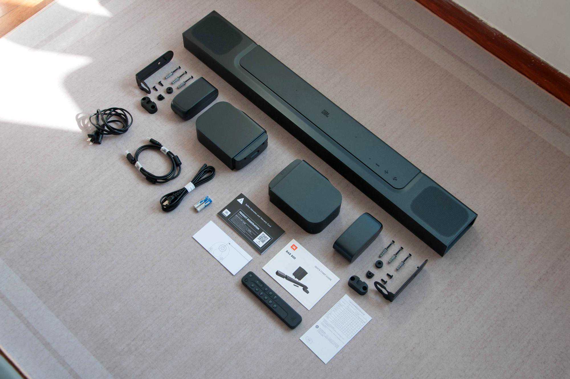 今天给大家介绍的新品是JBLBAR800真无线影霸,先看看都有哪些配件吧。全家福:主条形音箱×1,可拆卸无线环绕声扬声器×2,无线低音扬声器×1,遥控器(含两节7号电池)×1,电源线×2,HDMI电缆线×1,L形壁挂支架+U形壁挂支架套件×2(包含螺丝),快速入门指南×1,保修卡×1,安全说明书×1。别看满满一大桌子的配件,使用它很简单,你可以直接摆放在电视柜上用,也可以壁挂上墙使用,都很方便。
