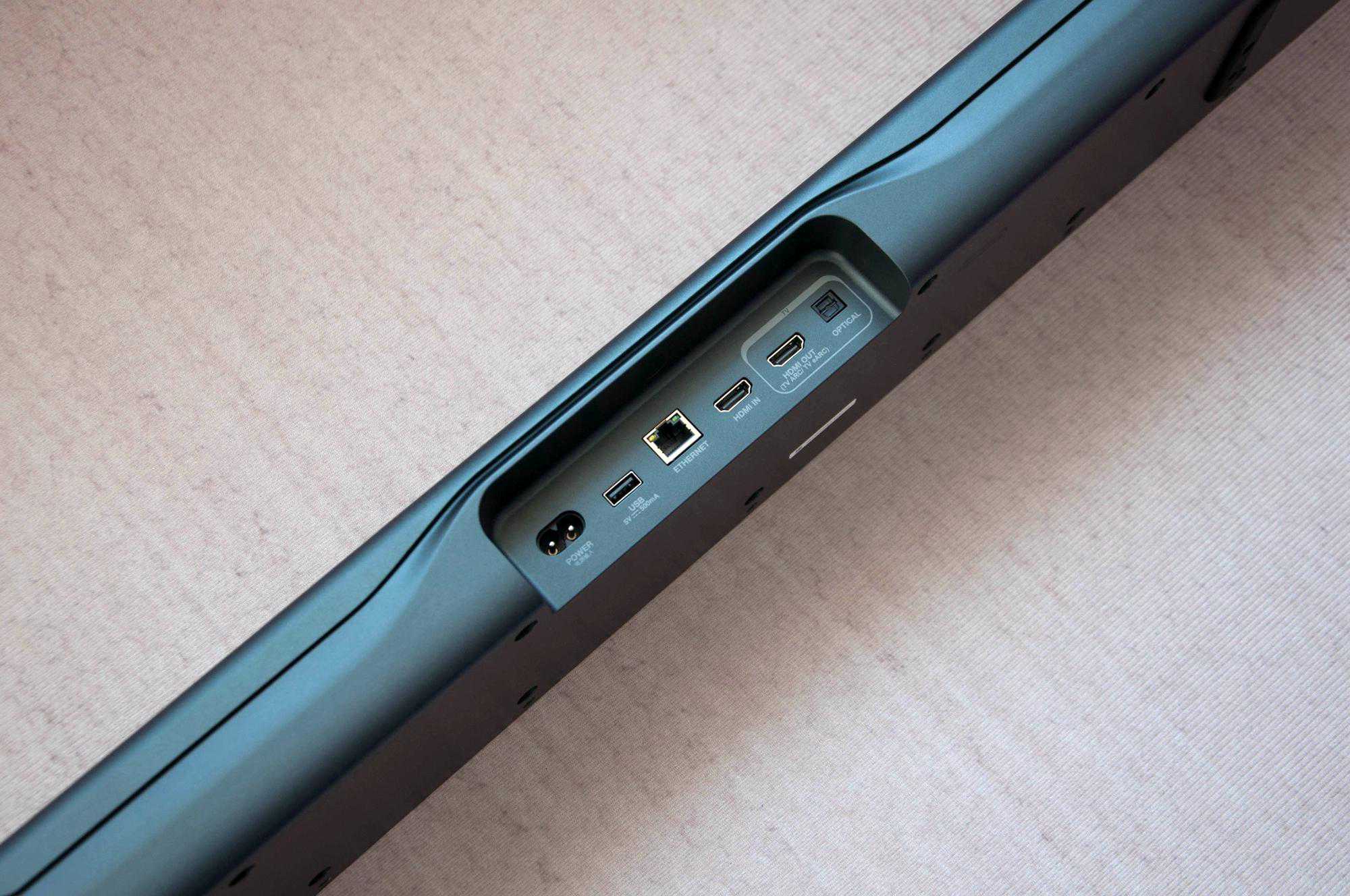 接口方面,从左至右分别是,电源接口、USB接口、网线接口、HDMIIN接口,HDMIOUT(TVARC/TVeARC)接口和一个OPTICAL光纤接口。大家可以根据自己需求,接入不同的设备,我家平时只用电源接口和HDMIOUT接口,所以连接方式也不难。