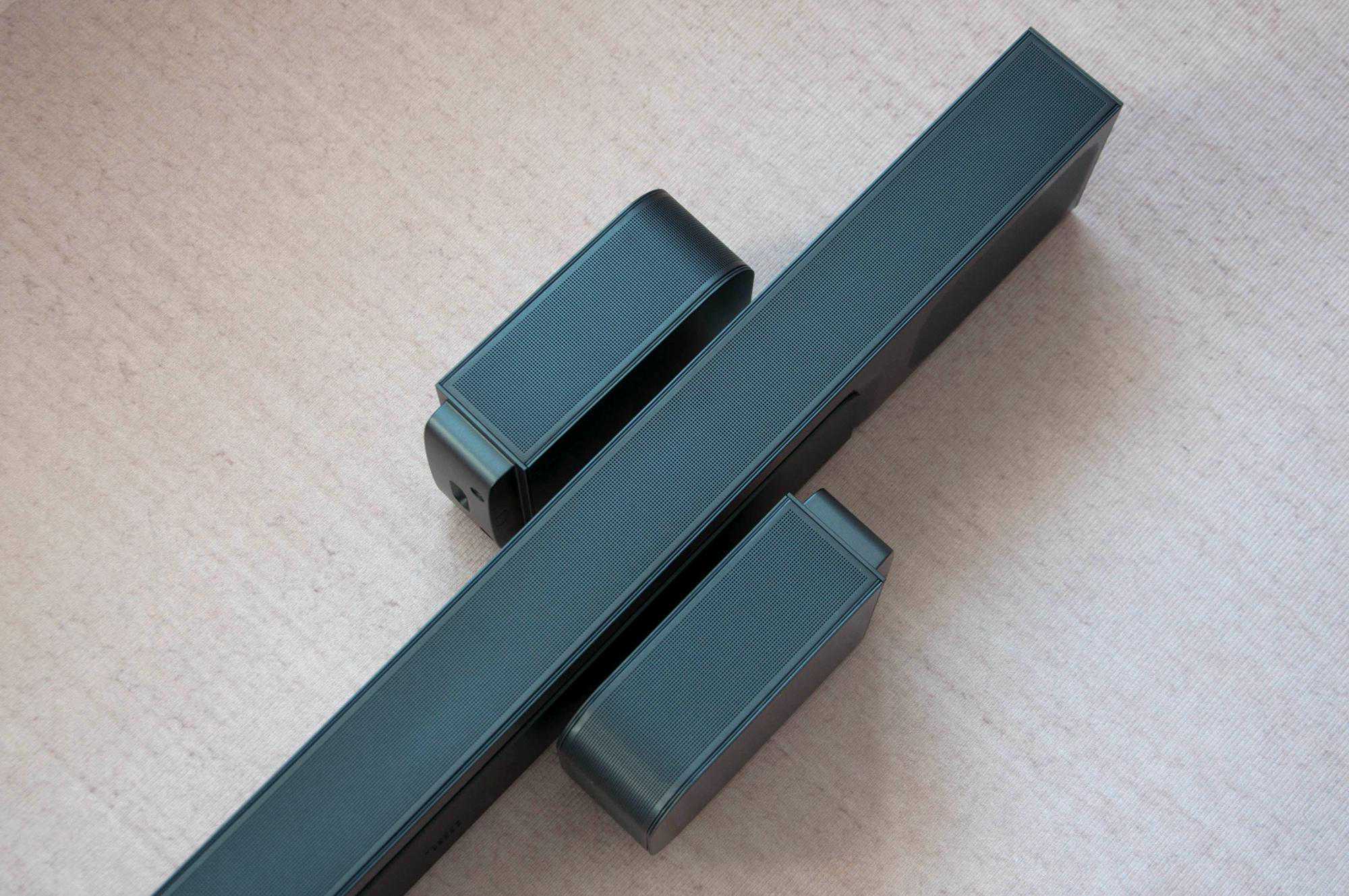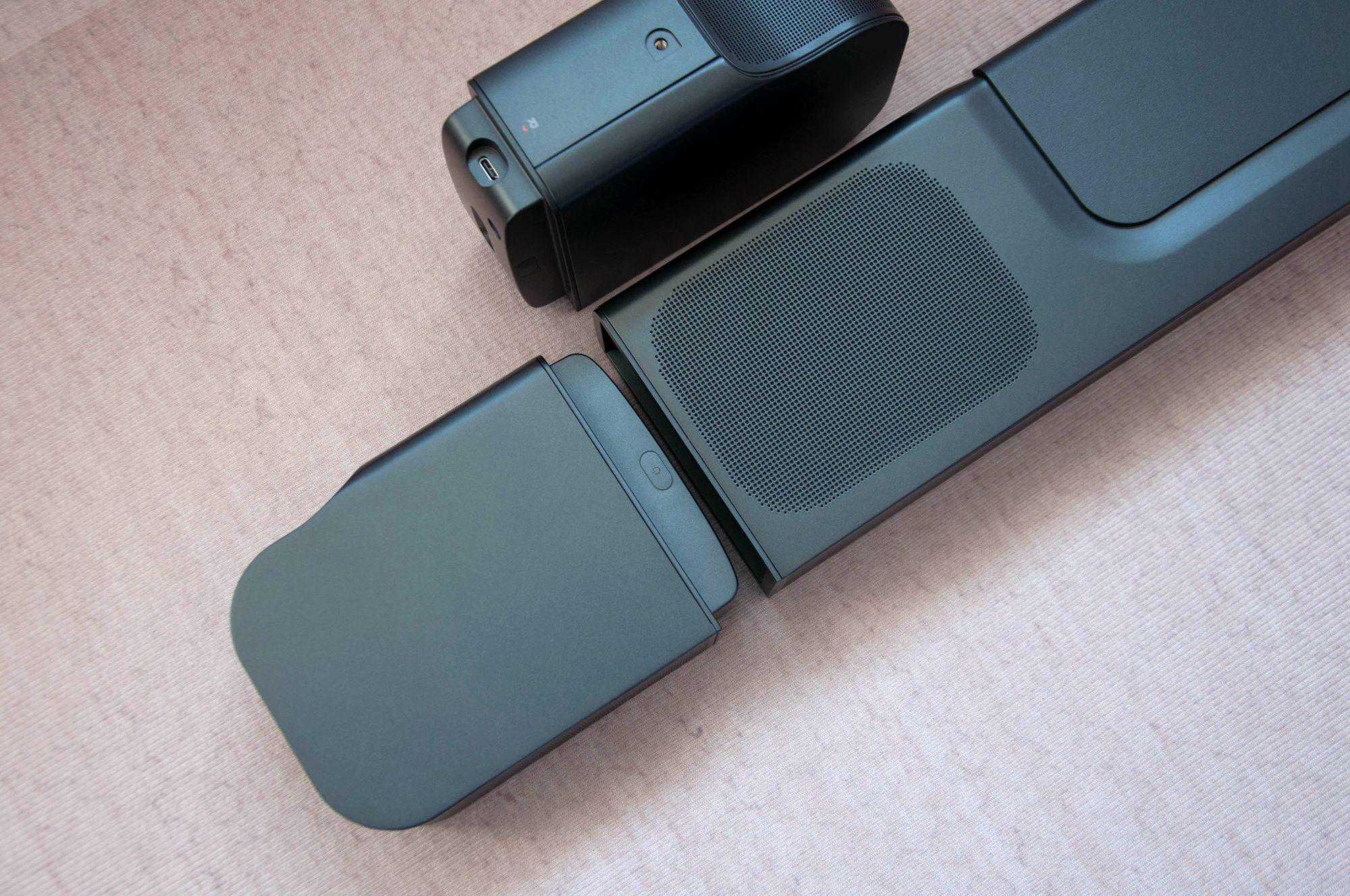 这是两个可拆卸环绕音箱,不需要插座,哪里需要直接取下摆到哪里就行。不用的时候吸附在主条形音箱的两端,还能自动充电。另外,每只可拆卸环绕音箱的一端都设计有Type-C充电口,如果是固定使用的话,也不需要担心电源问题,我们可以使用移动电源为其补电哦。