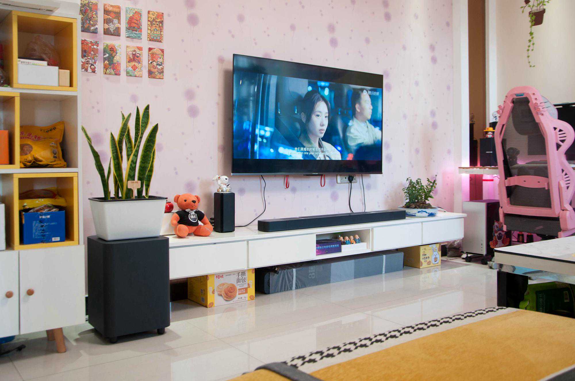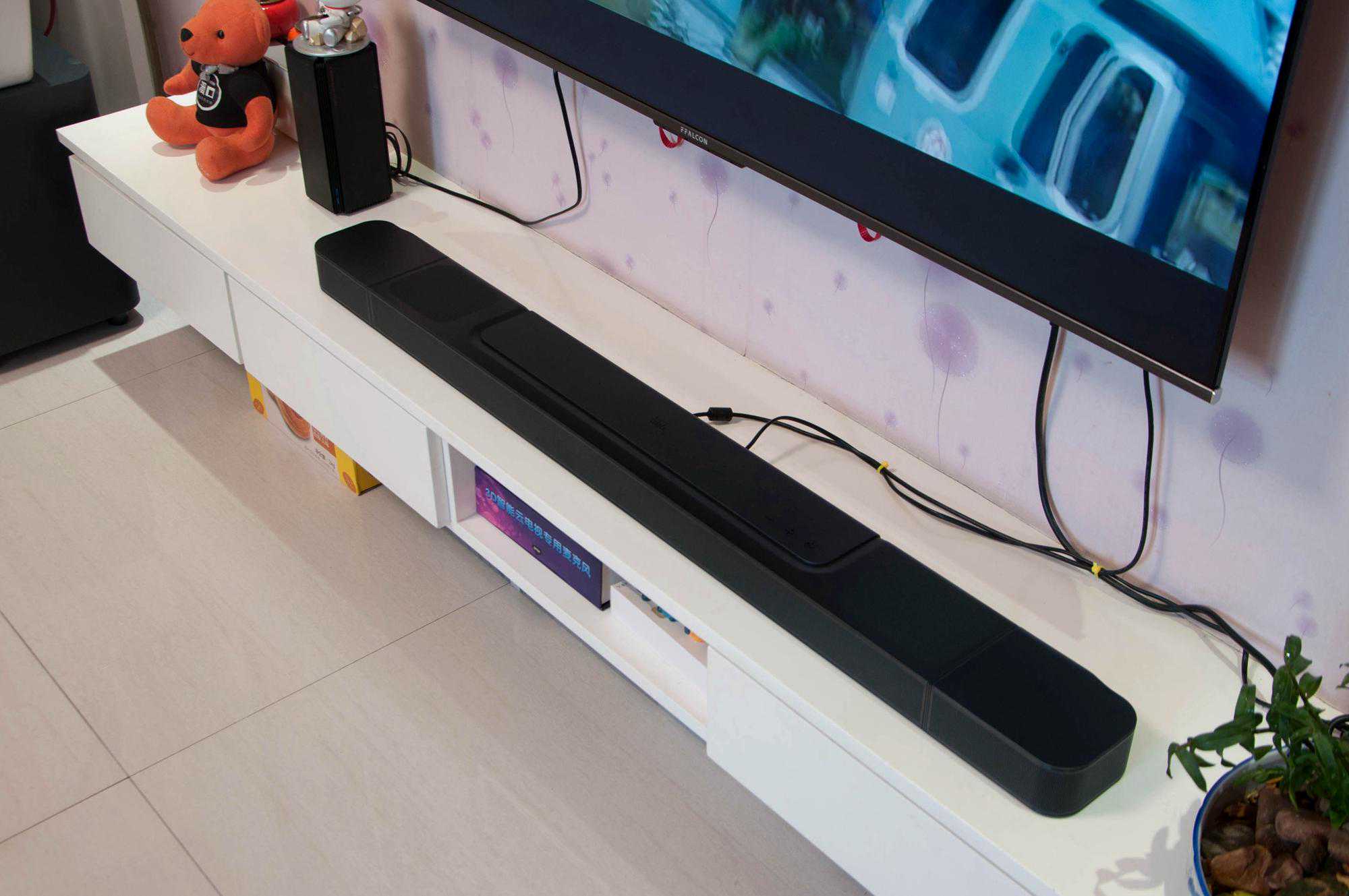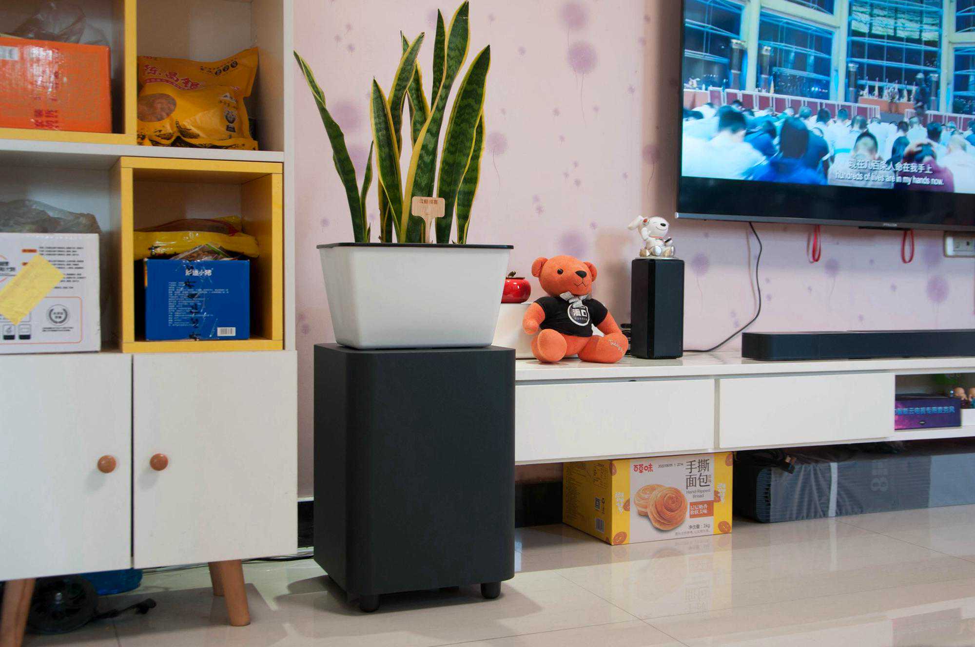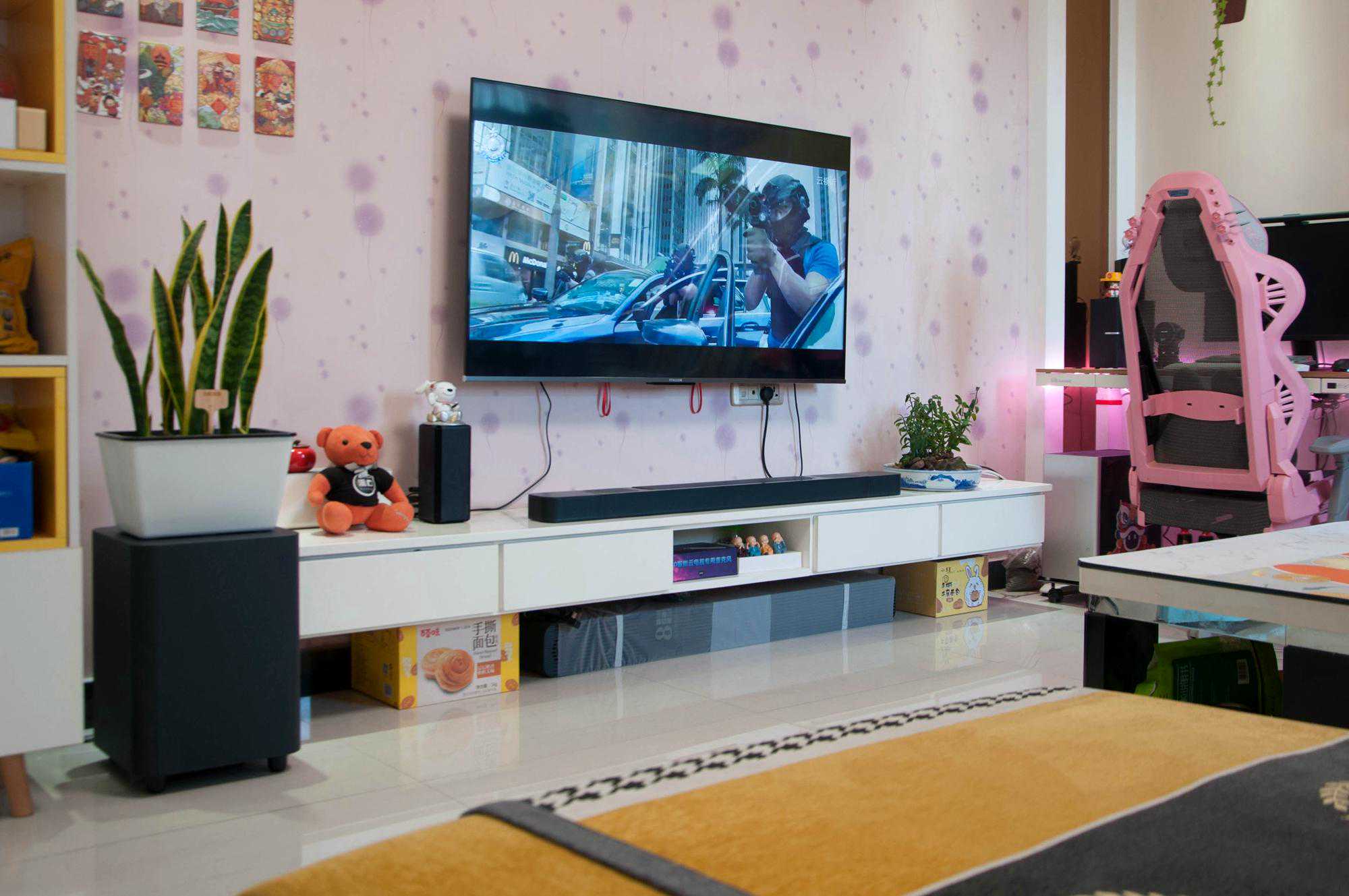 直接给大家看摆放到电视柜上的效果吧,我家电视是55英寸的,主条形音箱摆放在电视下方,大小刚好合适。这一次我把无线低音炮放在了电视柜一侧的地面上,平时还可以在上面摆放些花花草草,还挺协调。