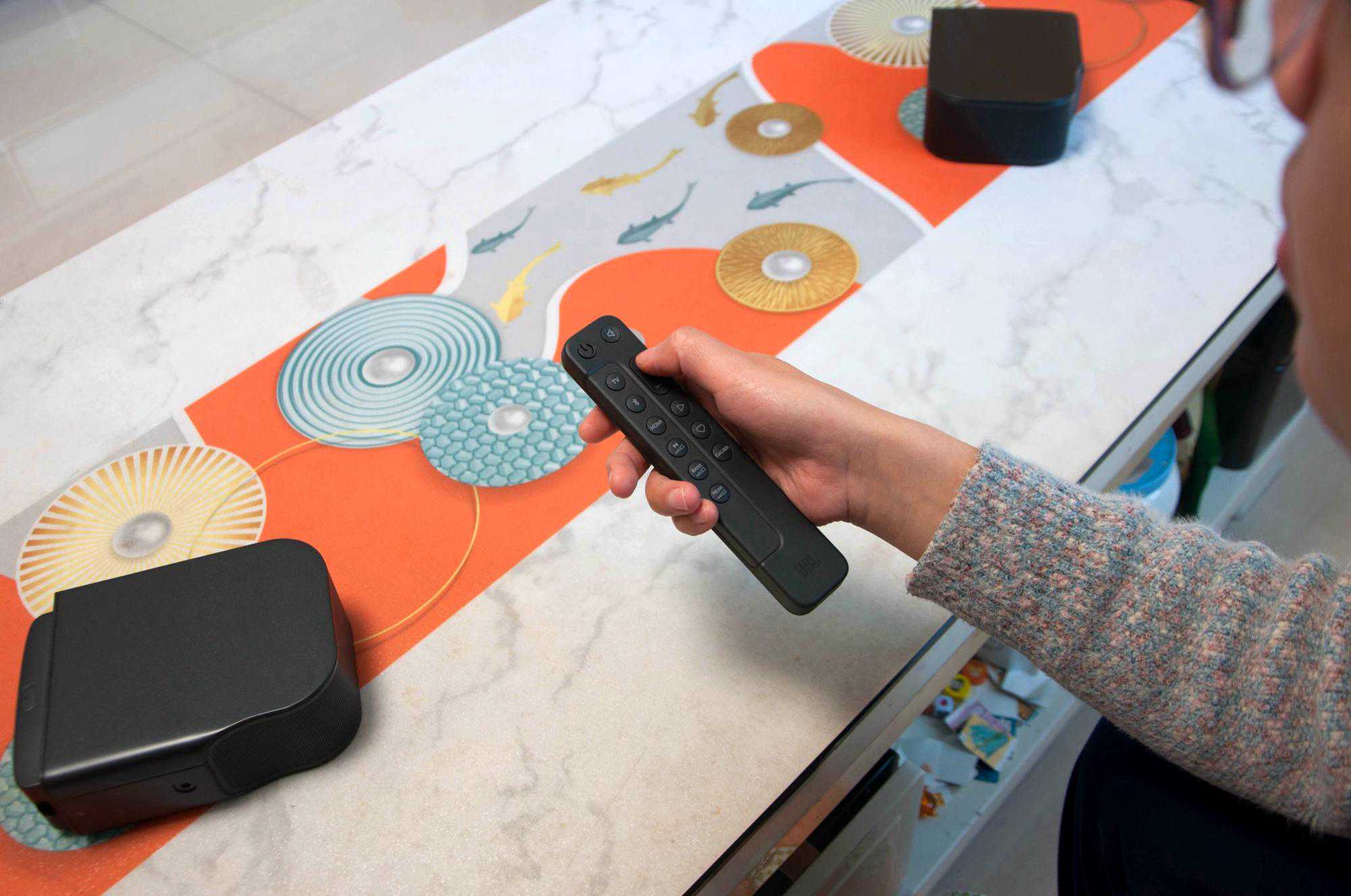 这是去掉后置扬声器后的样子,当然如果你觉得两边裸露着充电触点不美观的话,也可以卡入侧盖遮挡哦。两个后置扬声器你可以放到任何需要的地方,摆放后使用遥控器或者“JBLOne”APP都能进行校准。