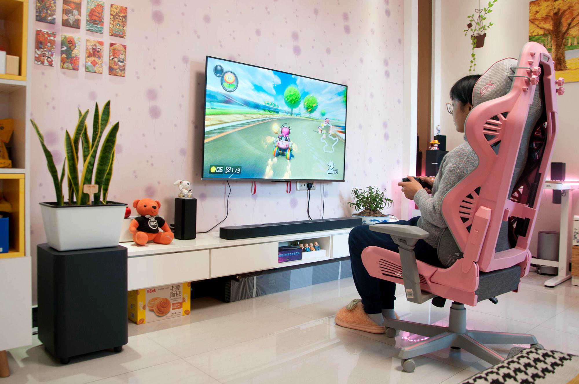 玩游戏更是一绝,媳妇和儿子都喜欢玩《马里奥赛车8》,搭配JBLBAR800真无线影霸玩,声效确实提升了一大截。画面的疾驰,加上手感的震动,再加上炸裂的音效,玩游戏的沉浸感满满,果然天空声道不是盖的,想不想来试试呢。