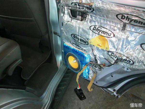 巡洋舰拆开门板内部已有一层塑料防尘罩撕掉防水膜,用干净的毛巾擦拭干净,然后再做隔音车门隔音处理之后车门钢板上的孔洞被隔音材料完全密封了,使车门形成了一个类似于音箱的箱体,为喇叭提供了一个更理想的工作环境,降低了因共振引起的谐波失真,声音会更干净有力