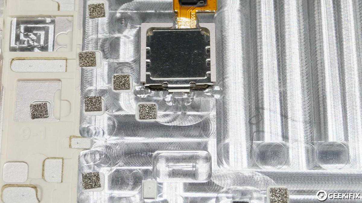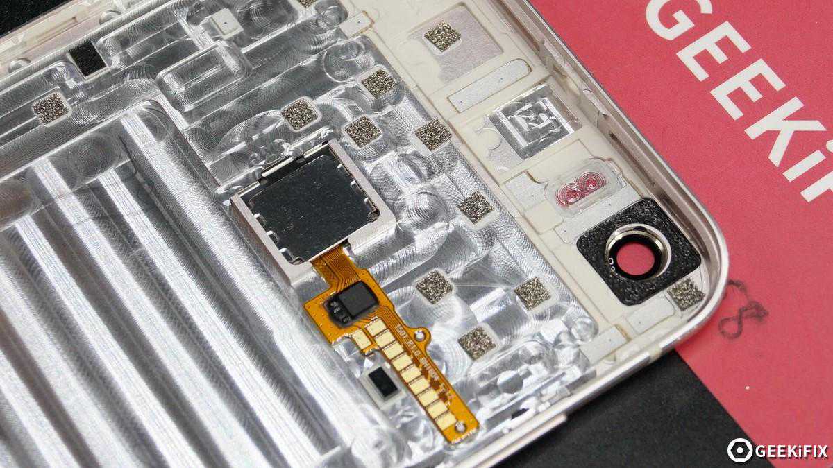 指纹模块固定在CNC加工的一体金属框内,并使用金属片加强固定。