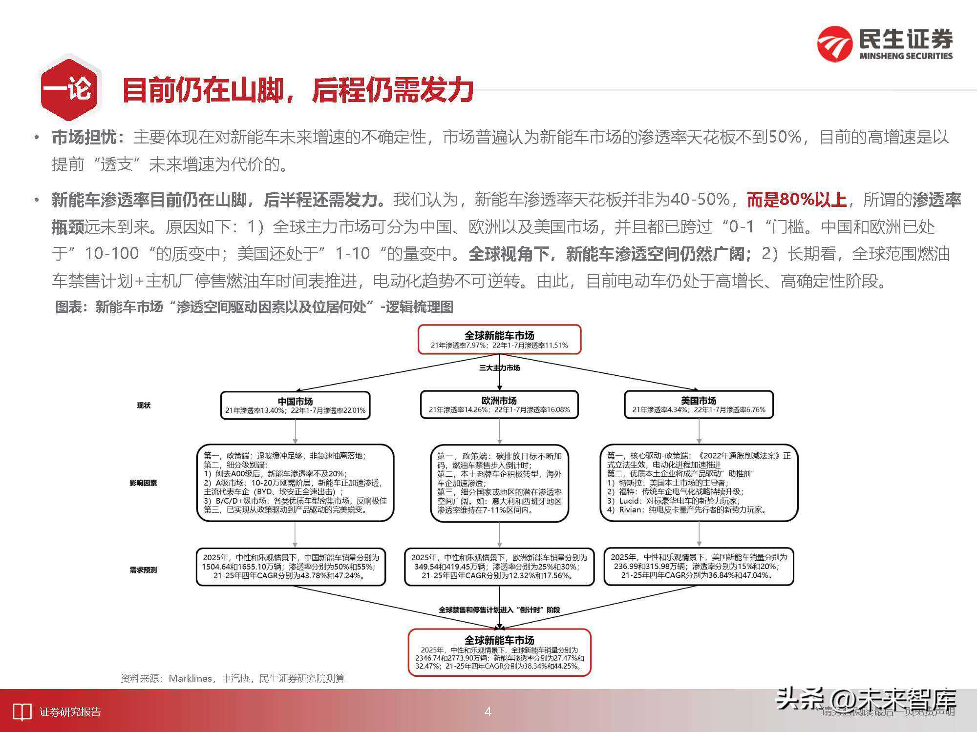目前仍在山脚,后程仍需发力市场担忧:主要体现在对新能车未来增速的不确定性,市场普遍认为新能车市场的渗透率天花板不到50%,目前的高增速是以提前“透支”未来增速为代价的。