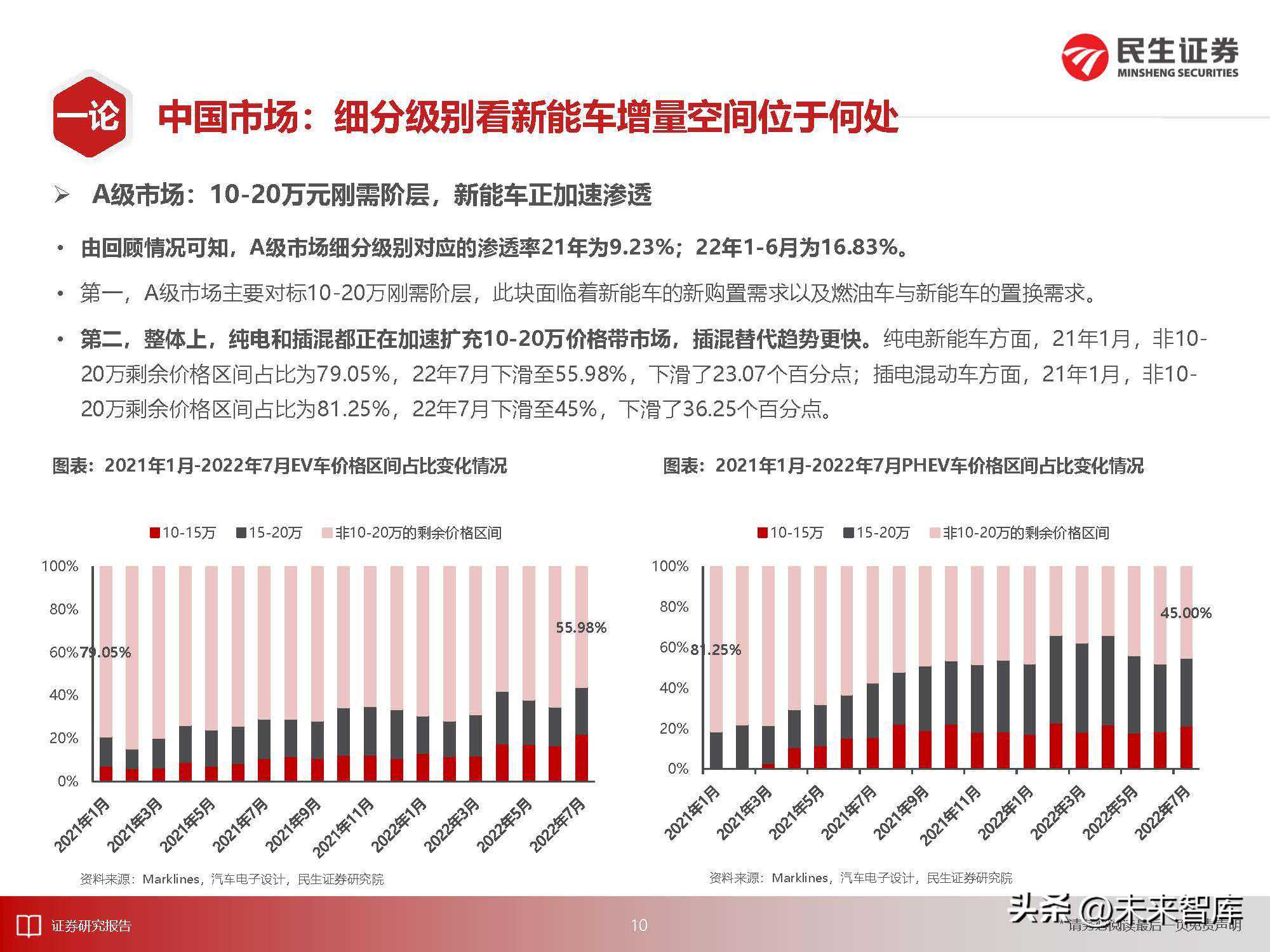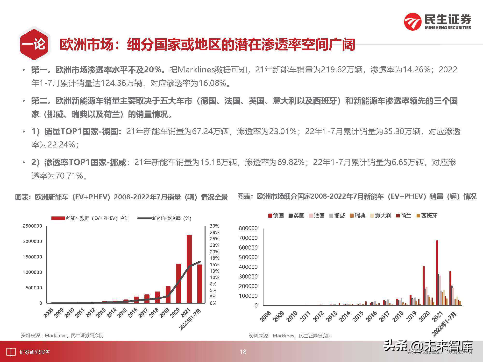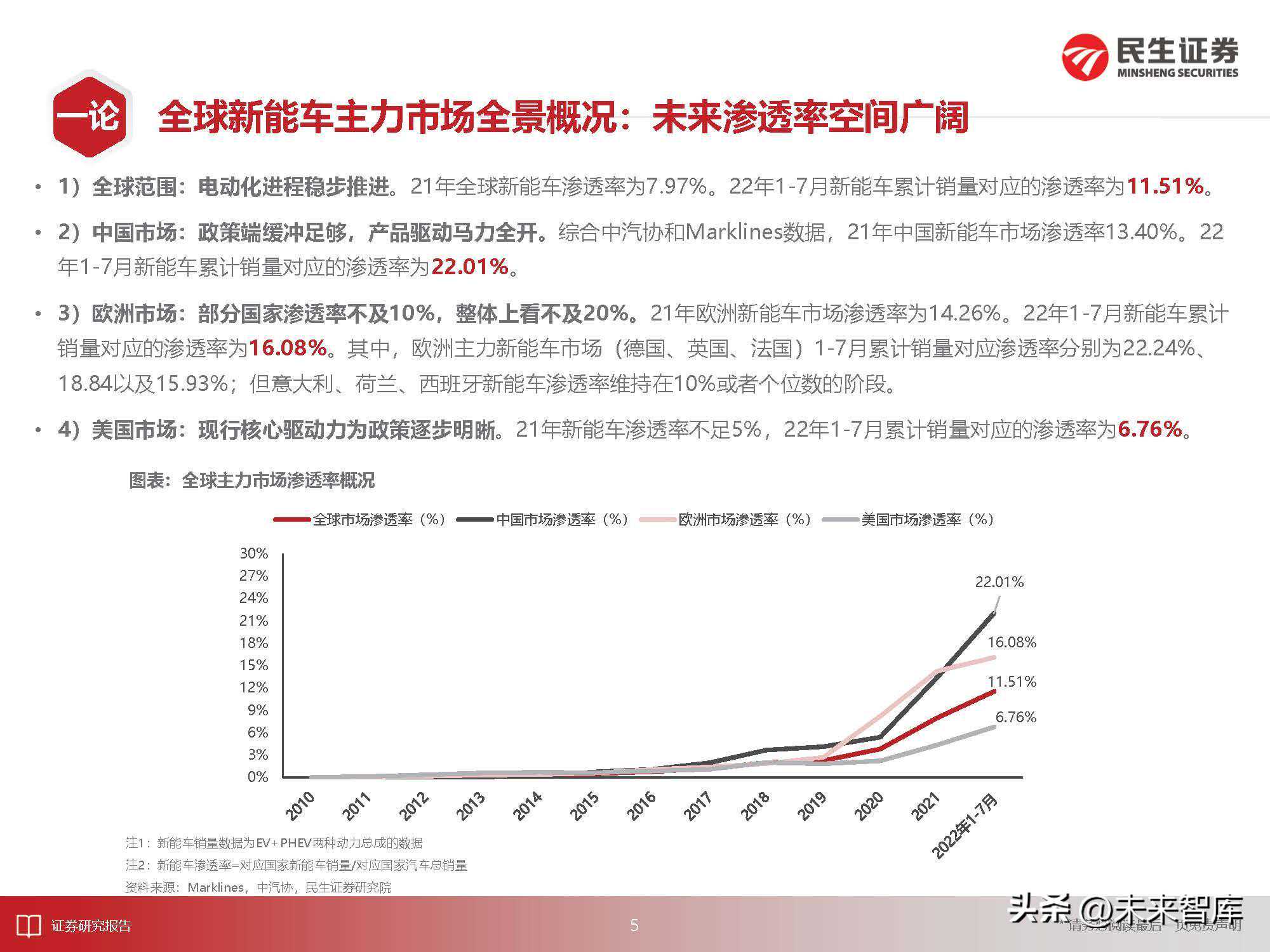 2)中国市场:政策端缓冲足够,产品驱动马力全开。综合中汽协和Marklines数据,21年中国新能车市场渗透率13.40%。22年1-7月新能车累计销量对应的渗透率为22.01%。
