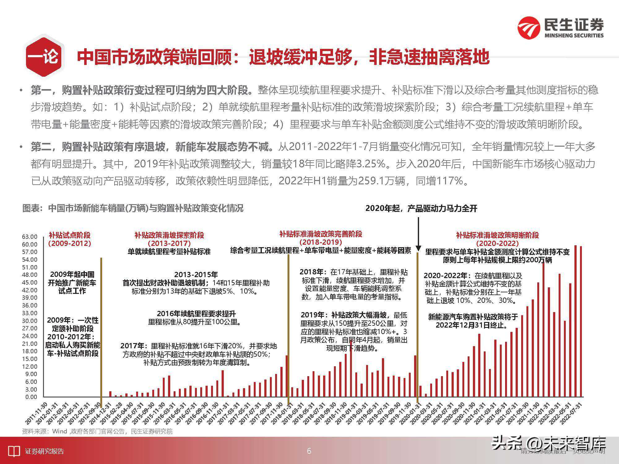 第二,购置补贴政策有序退坡,新能车发展态势不减。从2011-2022年1-7月销量变化情况可知,全年销量情况较上一年大多都有明显提升。其中,2019年补贴政策调整较大,销量较18年同比略降3.25%。步入2020年后,中国新能车市场核心驱动力已从政策驱动向产品驱动转移,政策依赖性明显降低,2022年H1销量为259.1万辆,同增117%。