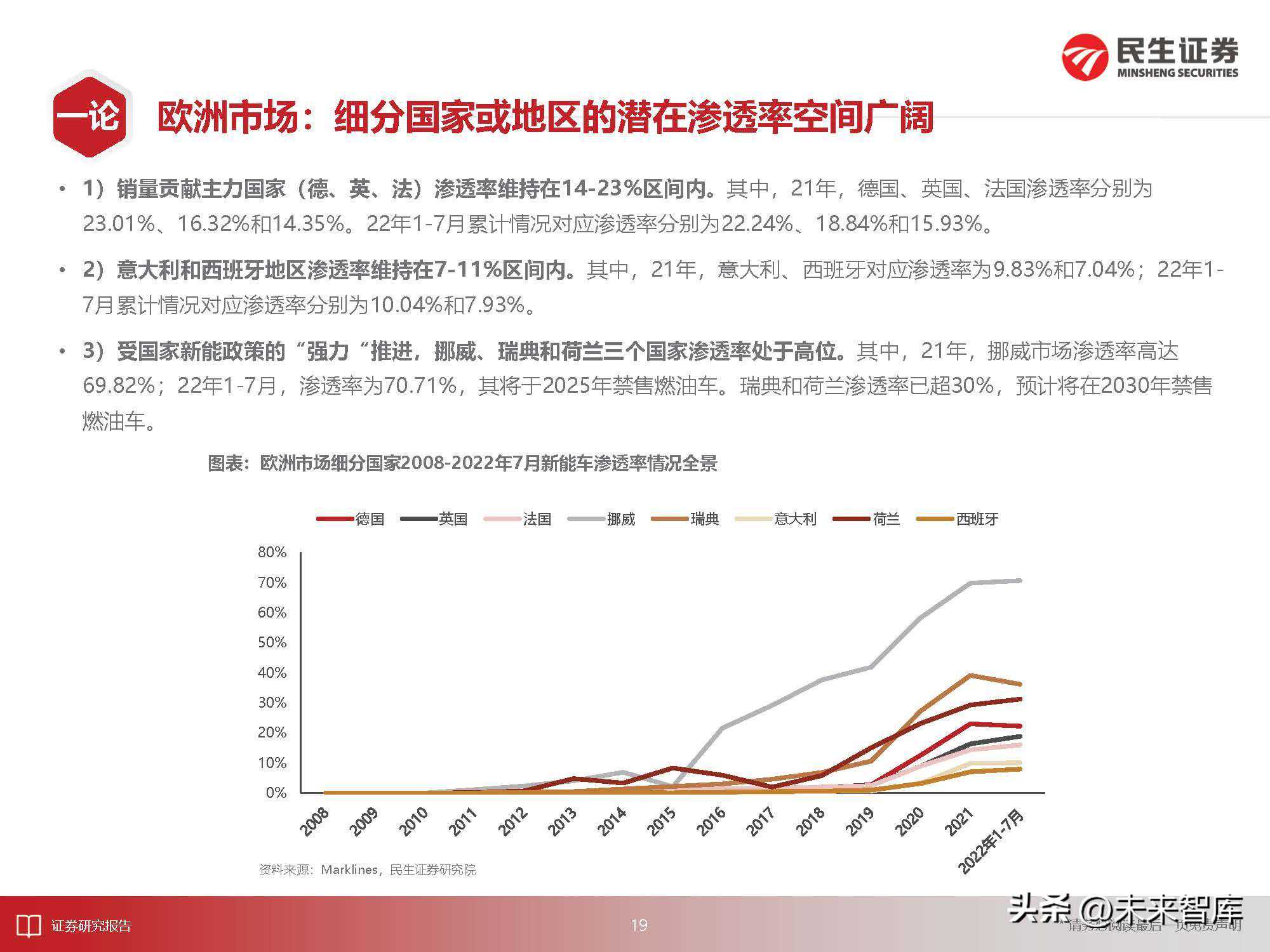 3)欧洲市场:部分国家渗透率不及10%,整体上看不及20%。21年欧洲新能车市场渗透率为14.26%。22年1-7月新能车累计销量对应的渗透率为16.08%。其中,欧洲主力新能车市场(德国、英国、法国)1-7月累计销量对应渗透率分别为22.24%、18.84以及15.93%;但意大利、荷兰、西班牙新能车渗透率维持在10%或者个位数的阶段。