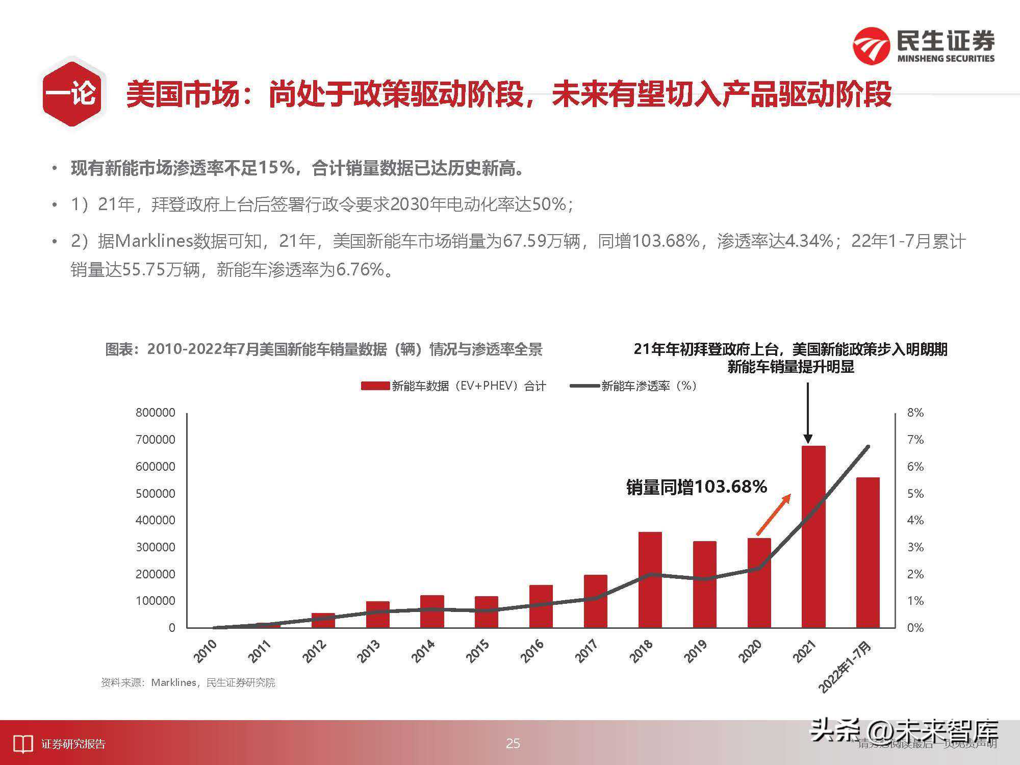 4)美国市场:现行核心驱动力为政策逐步明晰。21年新能车渗透率不足5%,22年1-7月累计销量对应的渗透率为6.76%。