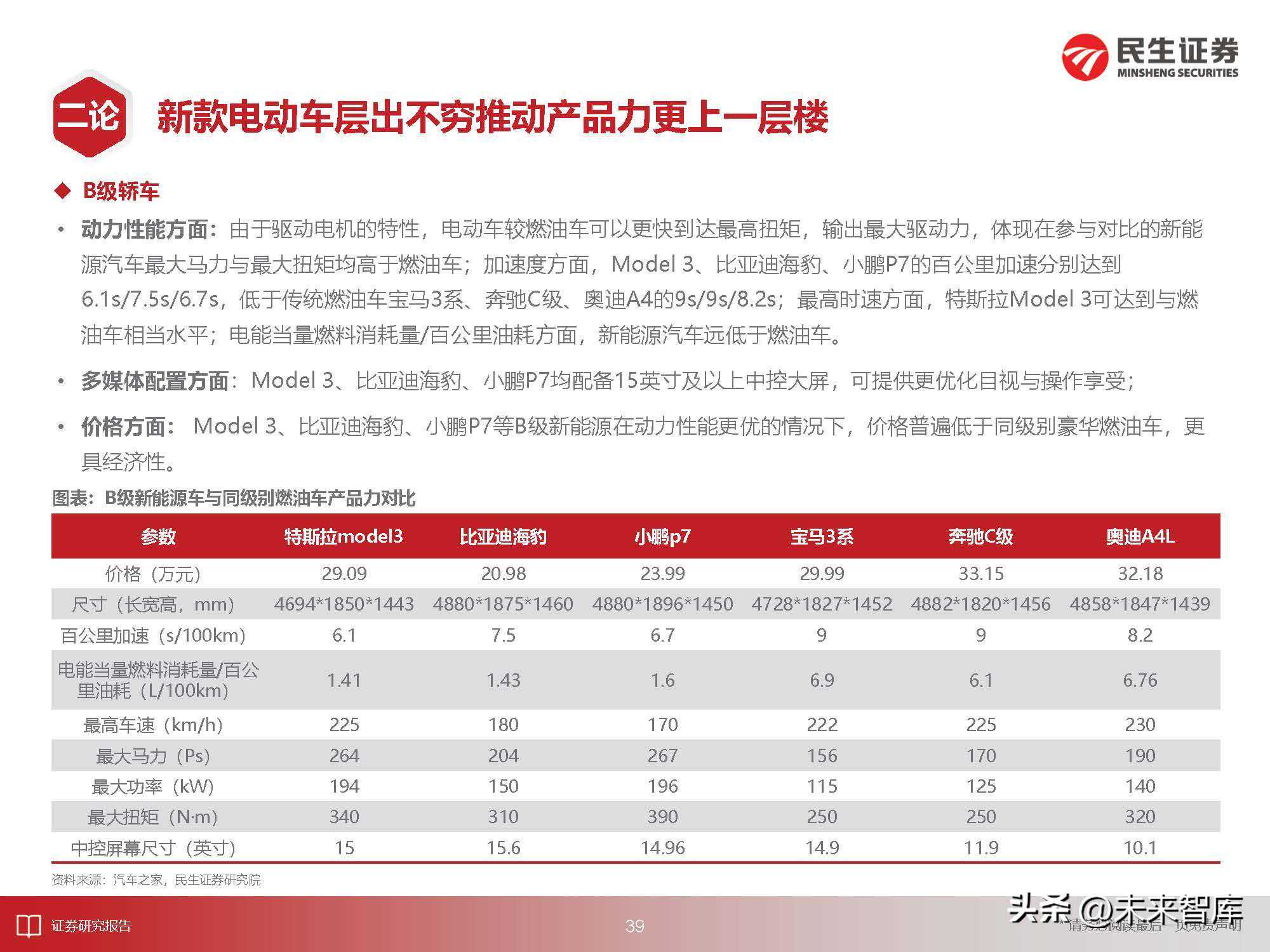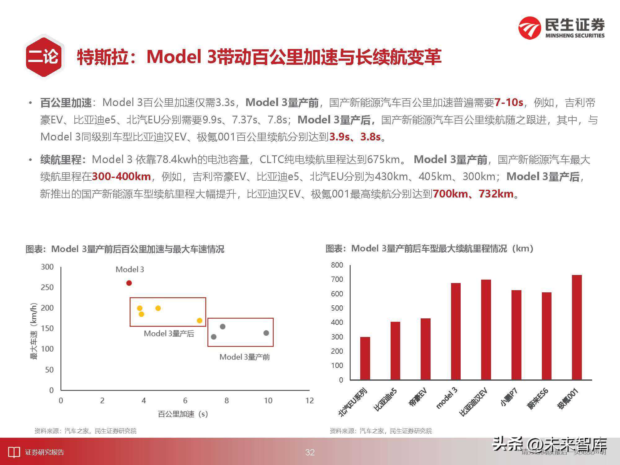 百公里加速:Model3百公里加速仅需3.3s,Model3量产前,国产新能源汽车百公里加速普遍需要7-10s,例如,吉利帝豪EV、比亚迪e5、北汽EU分别需要9.9s、7.37s、7.8s;Model3量产后,国产新能源汽车百公里续航随之跟进,其中,与Model3同级别车型比亚迪汉EV、极氪001百公里续航分别达到3.9s、3.8s。