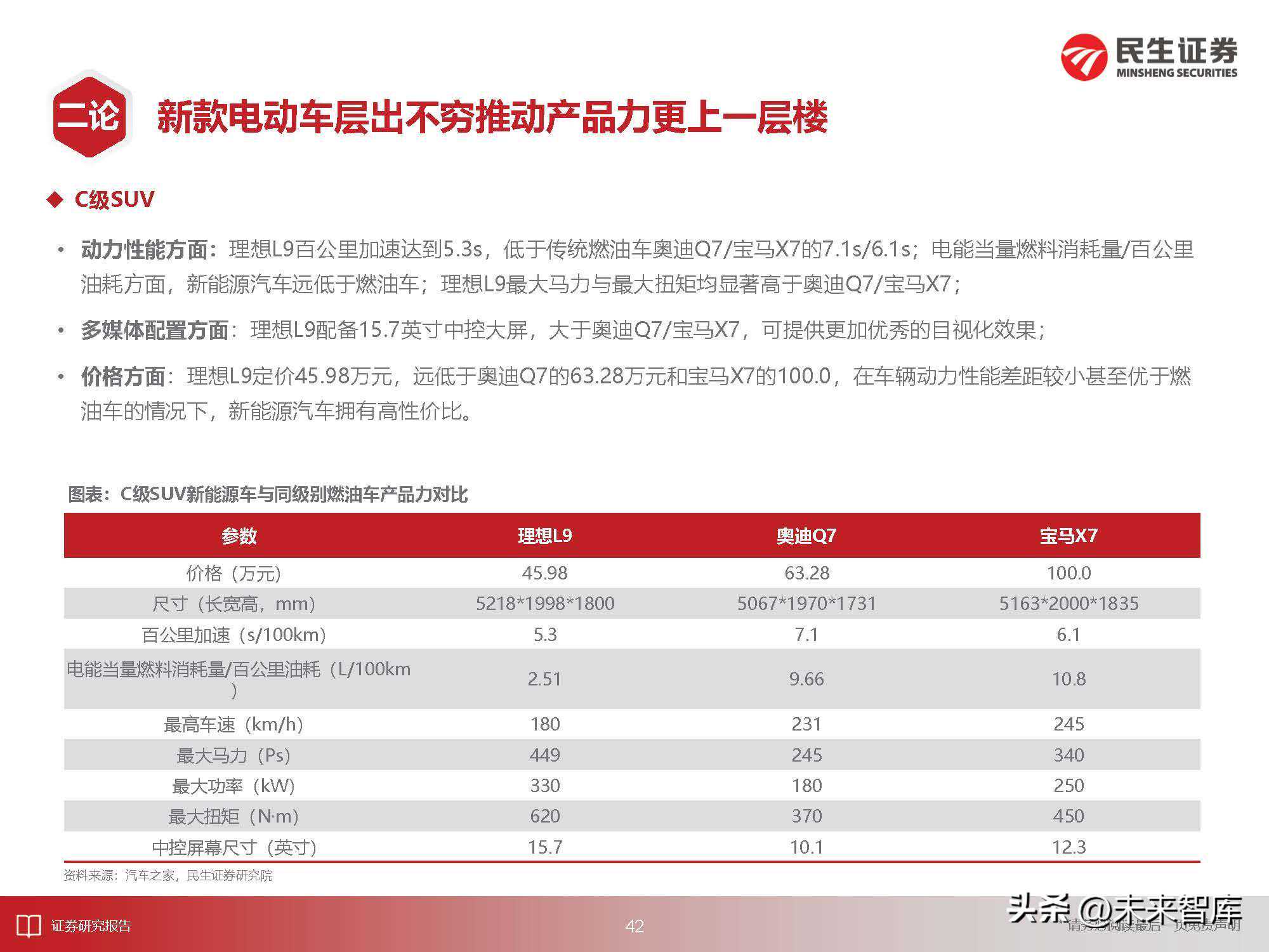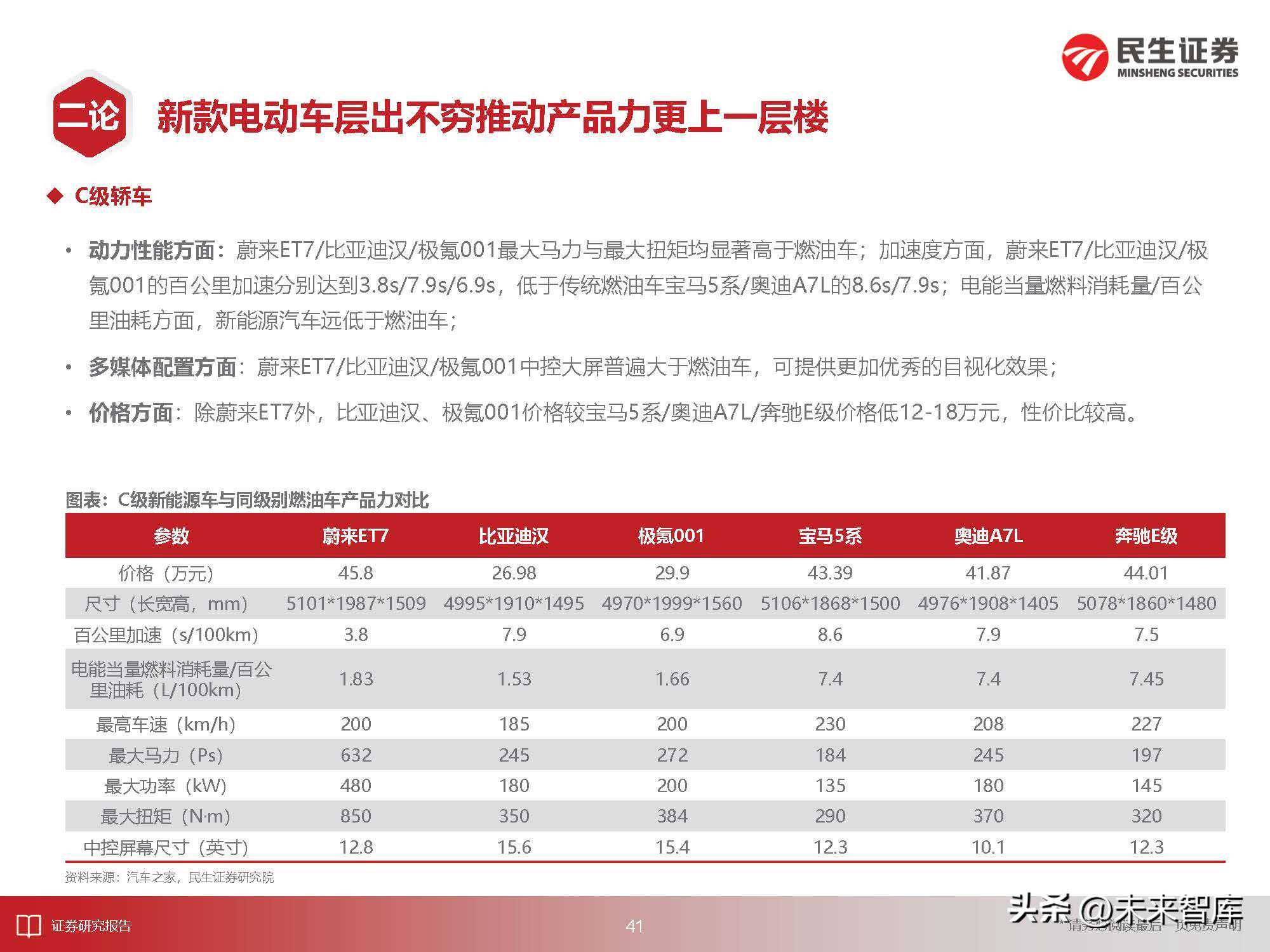 续航里程:Model3依靠78.4kwh的电池容量,CLTC纯电续航里程达到675km。Model3量产前,国产新能源汽车最大续航里程在300-400km,例如,吉利帝豪EV、比亚迪e5、北汽EU分别为430km、405km、300km;Model3量产后,新推出的国产新能源车型续航里程大幅提升,比亚迪汉EV、极氪001最高续航分别达到700km、732km。