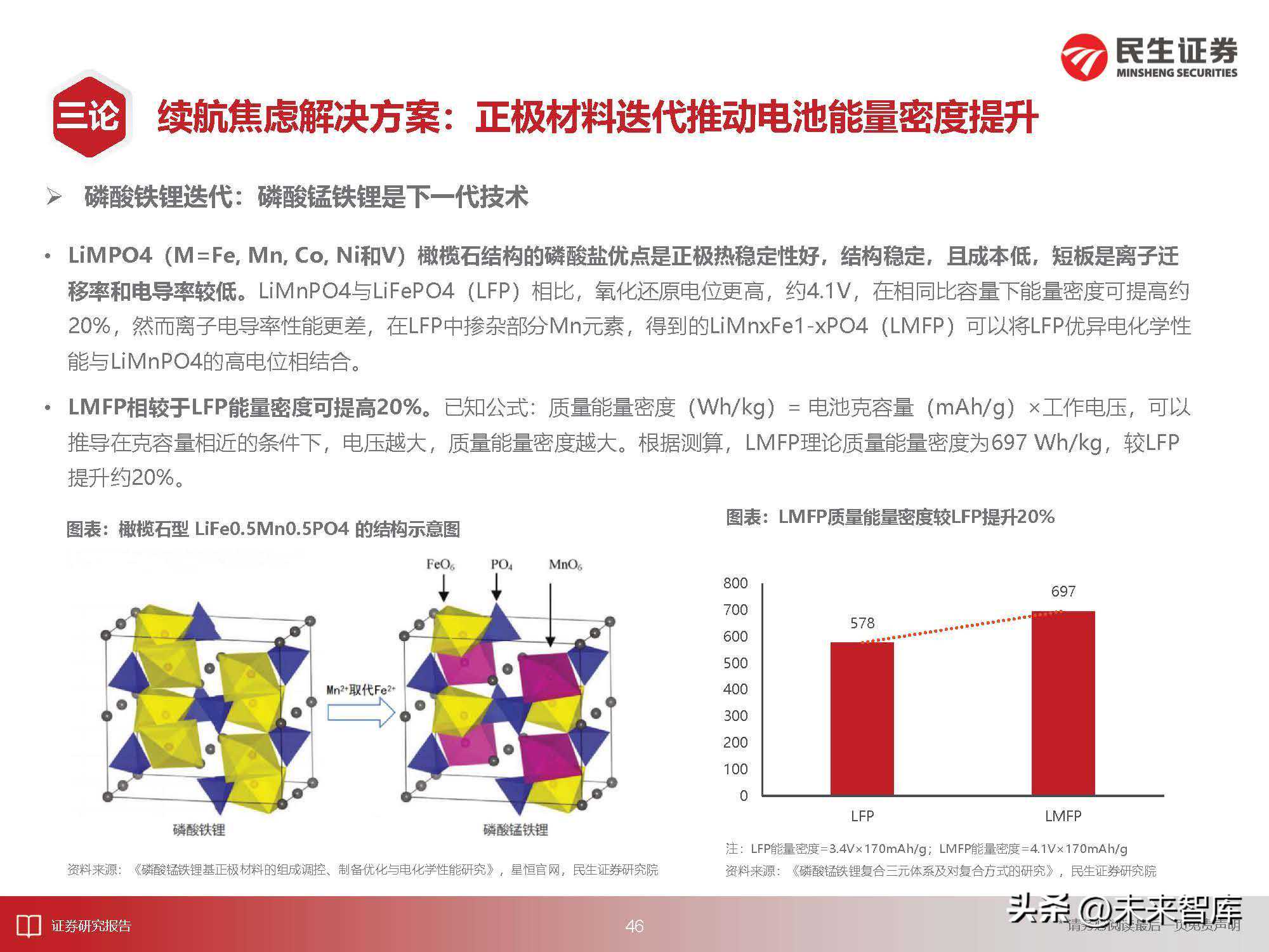 LMFP相较于LFP能量密度可提高20%。已知公式:质量能量密度(Wh/kg)=电池克容量(mAh/g)×工作电压,可以推导在克容量相近的条件下,电压越大,质量能量密度越大。根据测算,LMFP理论质量能量密度为697Wh/kg,较LFP提升约20%。