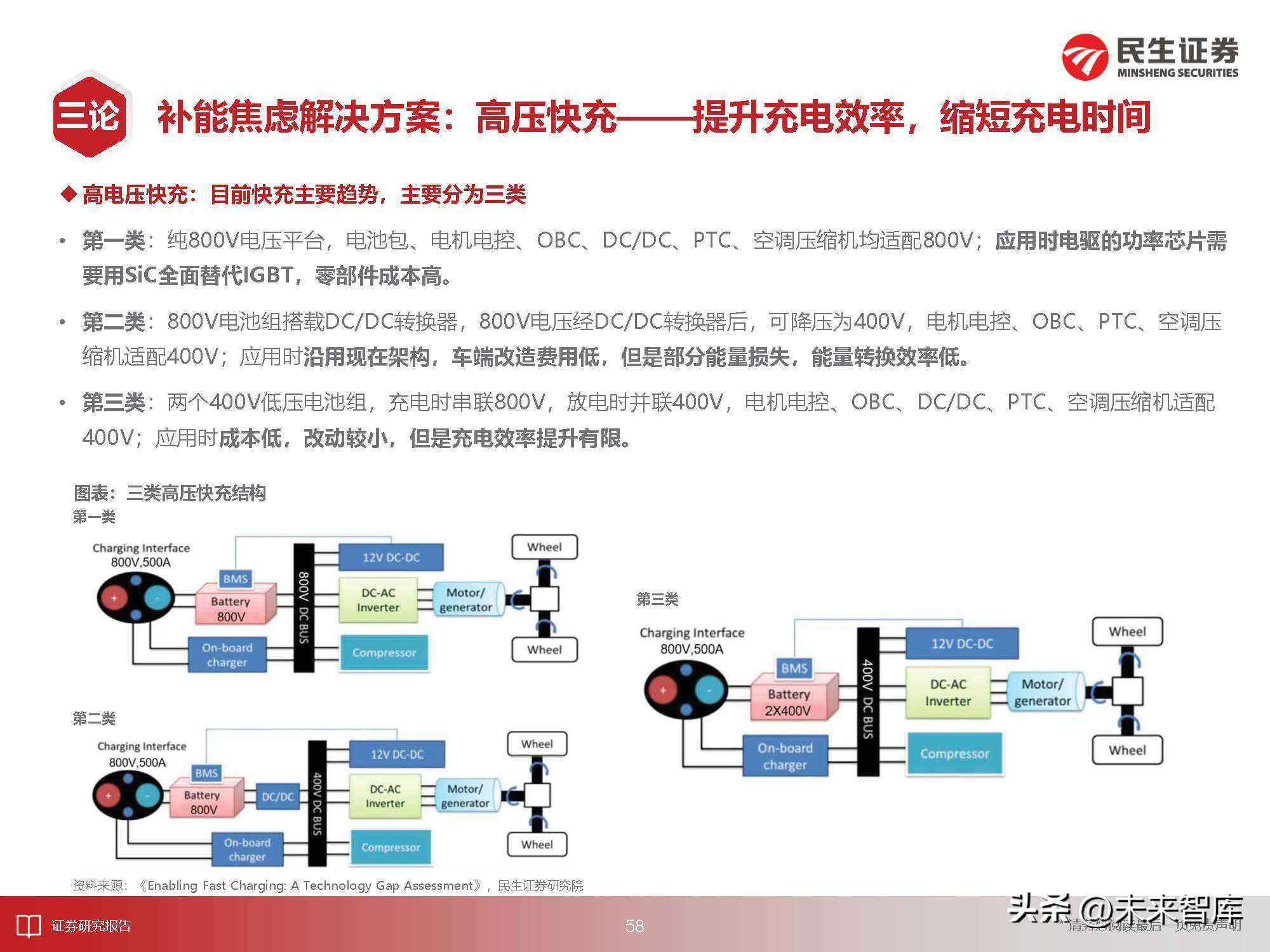 电动化趋势不可逆转,内燃机终将被替代:1)电动机性能全面领先内燃机:我们选取了新能车代表车企特斯拉与比亚迪相关车型(20-30万价格区间)与BBA车企相关车型(30-40万区间)进行对比,电动机在能量转换效率、最大功率、最大扭矩、环保性以及噪音等方面具有显著优势。2)新能车体系持续升级迭代,直击三大核心焦虑。续航焦虑端:超高镍化、LMFP、硅碳负极等电化学体系端的完善;安全焦虑端:麒麟电池、刀片电池、CTB、复合集流体等升级;补能焦虑端:快充加快渗透,充电+换电稳步推进。3)内燃机“停止研发“步入倒计时,”马达轰鸣”将成过去式。车企相继宣布内燃机停止研发计划,彰显全面推进电动化转型的决心。如:日产、奥迪、大众以及宝马MINI等传统车企已开始推进,作为燃油车“心脏”的内燃机,将不再更新迭代。因此,电动化是滚滚历史巨轮下的必然。汽车驱动系统终将呈现出“蒸汽机-早期电动机-内燃机-电动机”的迁移态势。