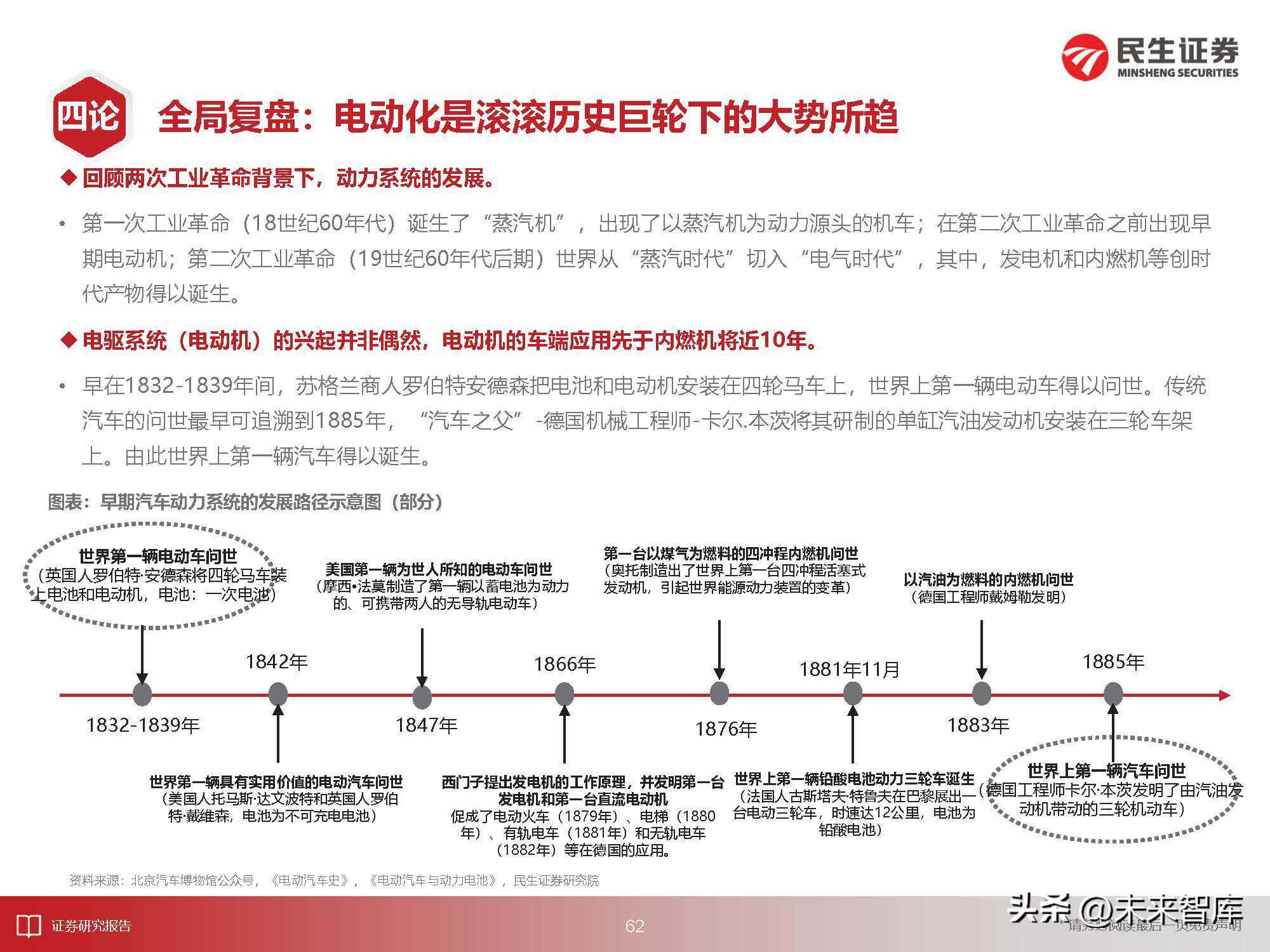 全局复盘:电动化是滚滚历史巨轮下的大势所趋早期电动机在汽车端的应用受制于电池的“落后”