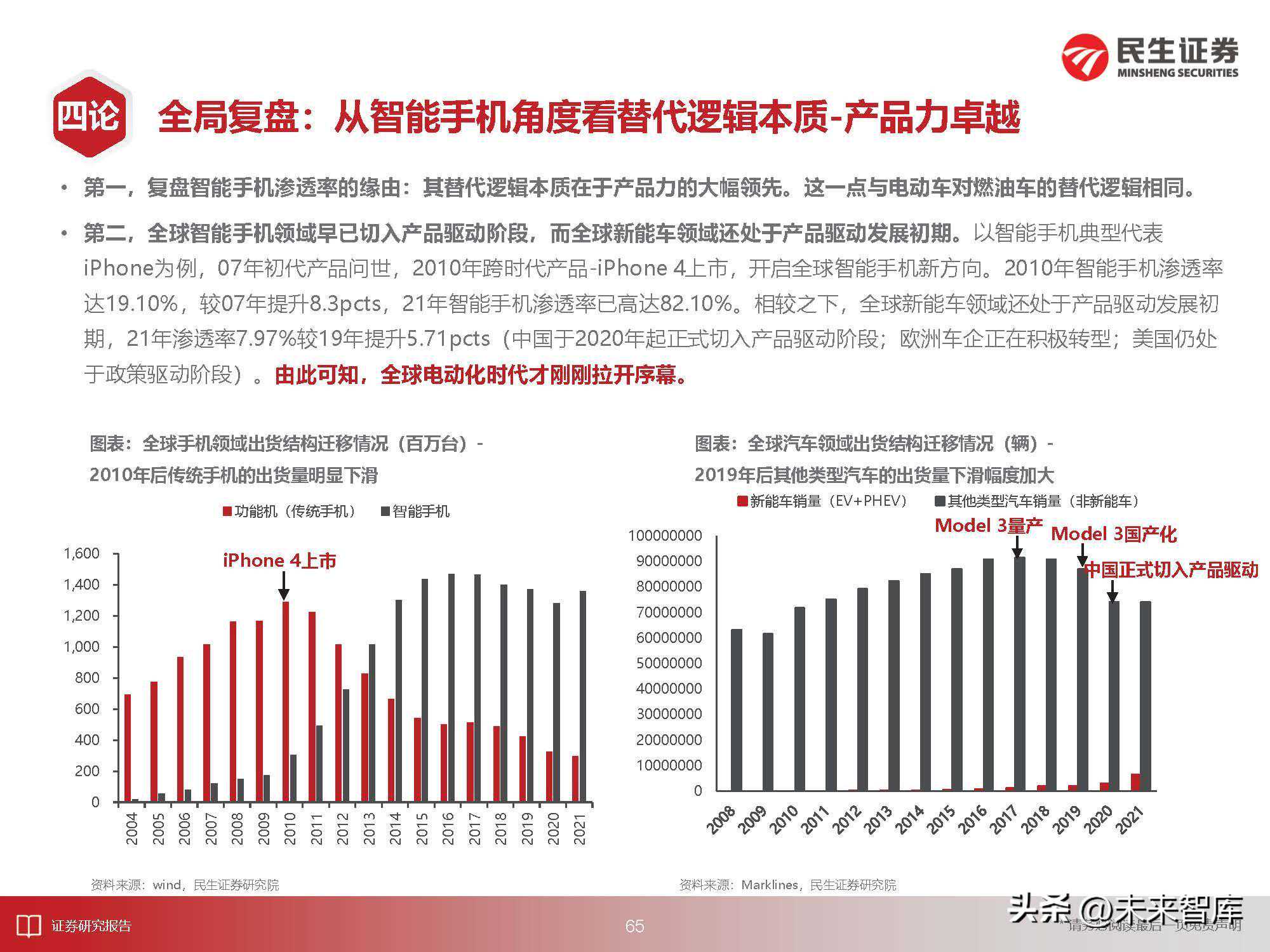 第一,复盘智能手机渗透率的缘由:其替代逻辑本质在于产品力的大幅领先。这一点与电动车对燃油车的替代逻辑相同。第二,全球智能手机领域早已切入产品驱动阶段,而全球新能车领域还处于产品驱动发展初期。以智能手机典型代表iPhone为例,07年初代产品问世,2010年跨时代产品-iPhone4上市,开启全球智能手机新方向。2010年智能手机渗透率达19.10%,较07年提升8.3pcts,21年智能手机渗透率已高达82.10%。相较之下,全球新能车领域还处于产品驱动发展初期,21年渗透率7.97%较19年提升5.71pcts(中国于2020年起正式切入产品驱动阶段;欧洲车企正在积极转型;美国仍处于政策驱动阶段)。由此可知,全球电动化时代才刚刚拉开序幕。