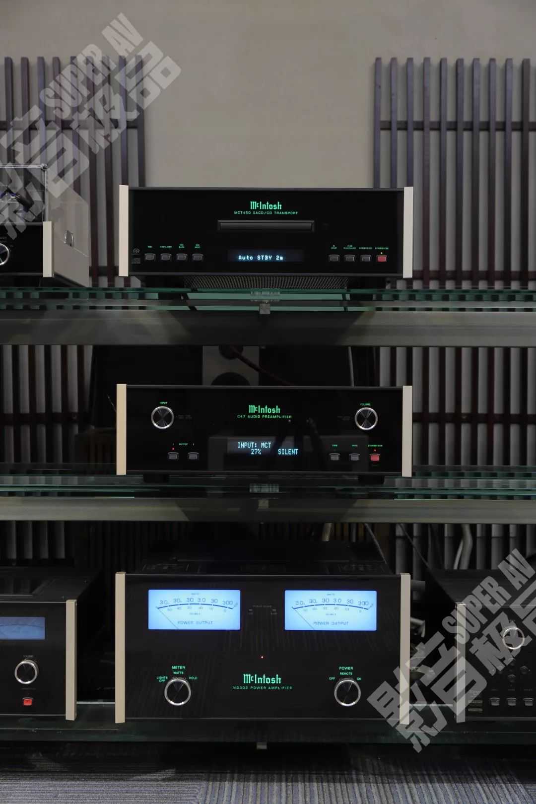 自上而下分别是:麦景图MCT450CD播放器、C47数码前级放大器以及MC302立体声后级