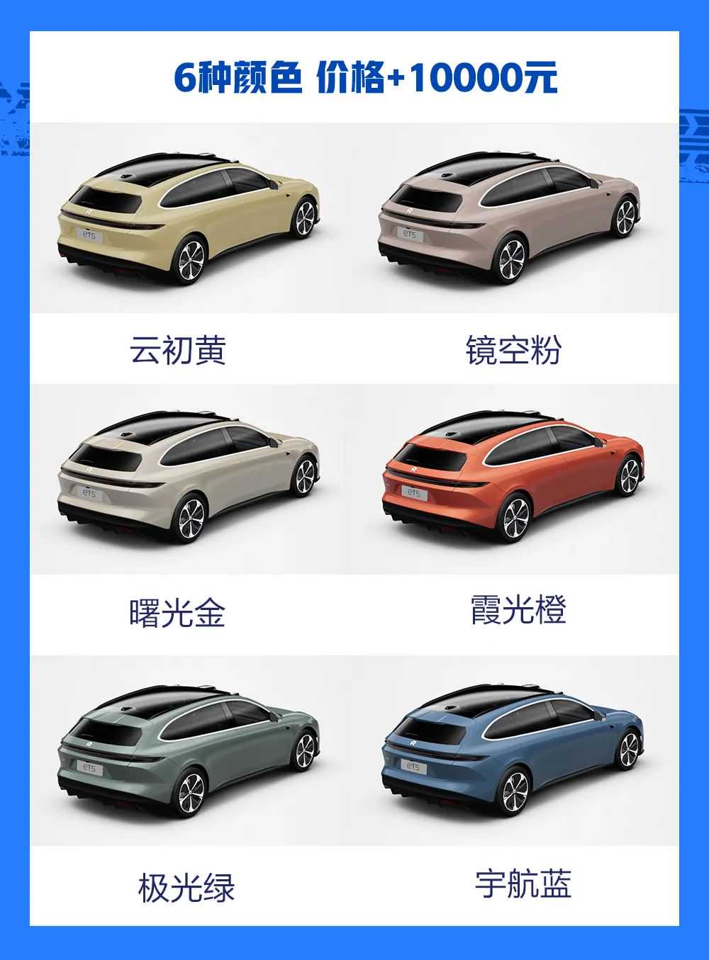 ET5Touring与轿车版共享配色方案,共有10种车漆颜色可选,包括2023款年度色曙光金、ET5车系专属镜空粉和云初黄(旅行版和普通版共享),另外6种蔚来的经典色深空黑、云白、星灰、同温层蓝、极光绿、霞光橙、宇航蓝当然也在可选范围内。