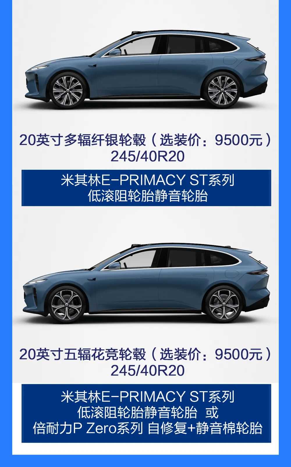 蔚来ET5Touring提供4款轮毂设计+3种轮胎类型,除了19英寸五辐锐帆轮毂为免费的款式之外,其余三款轮毂均需掏钱选装,价格为3500元或9500元。